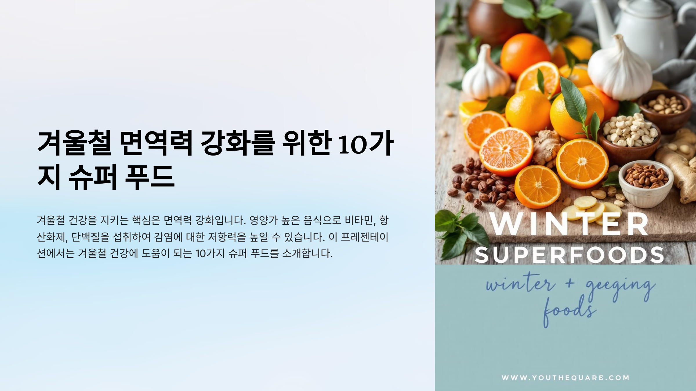 겨울철 면역력을 강화하려면 영양가 높은 음식을 섭취하는 것이 중요합니다. 특히 면역력을 높이고 감염에 저항할 수 있는 비타민, 항산화제, 단백질이 풍부한 음식들이 추천됩니다. 다음은 겨울철 건강을 지켜주는 베스트 10 음식을 소개합니다.