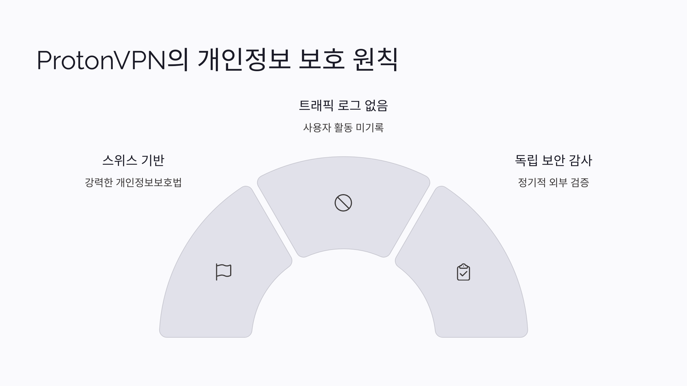 ProtonVPN은 스위스에 본사를 두고 있어요. 스위스는 매우 강력한 개인정보 보호법을 가진 국가로, VPN 사업자들이 사용자 정보를 저장하거나 외부에 제공하는 것을 법적으로 엄격히 금지하고 있어요.