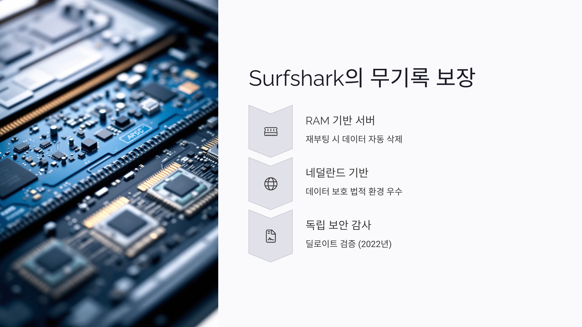 또한 Surfshark도 RAM 전용 서버만을 사용하고 있어서, 데이터를 저장하지 않고 자동 삭제가 가능해요. 이 덕분에 고객 정보를 저장할 수 있는 여지가 원천 차단돼요.
