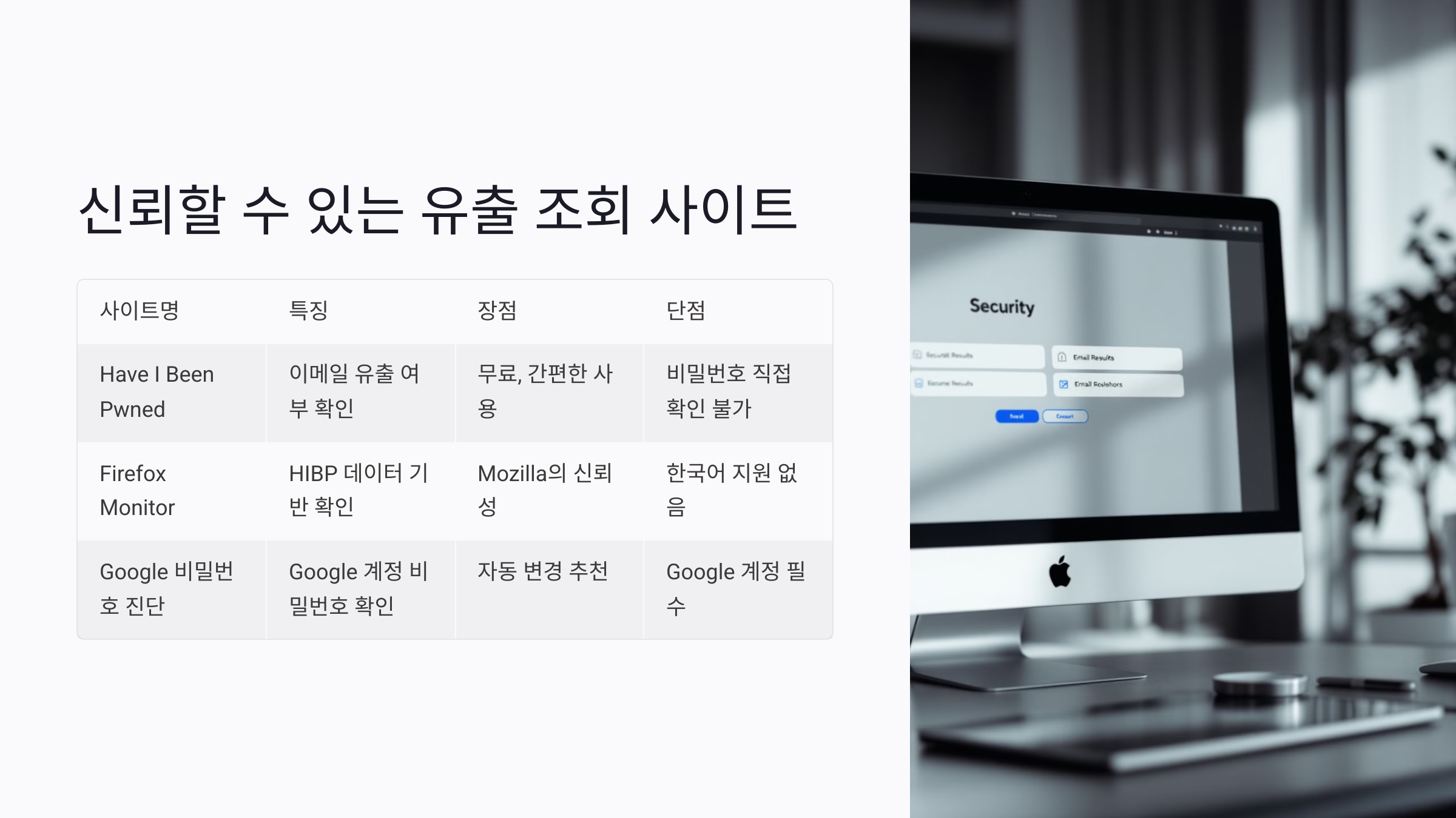 | Have I Been Pwned | 이메일을 입력하면 유출 여부 확인 가능 | 무료, 간편한 사용 | 비밀번호 직접 확인 불가 |