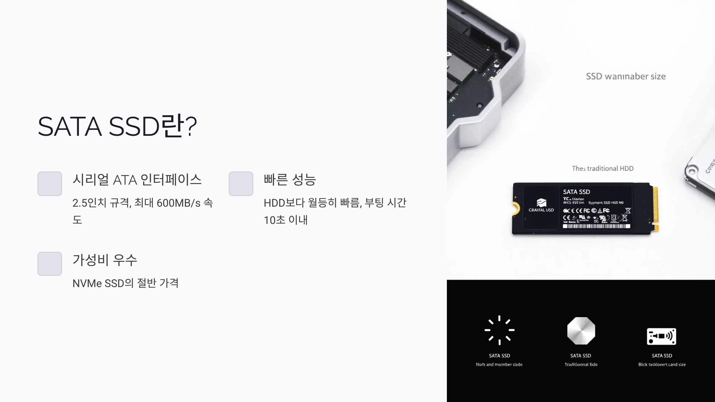 A6. SATA SSD는 NVMe보다 발열이 적어요. 별도의 방열판 없이도 사용 가능하지만, 환기가 잘 되는 환경이 좋긴 해요.