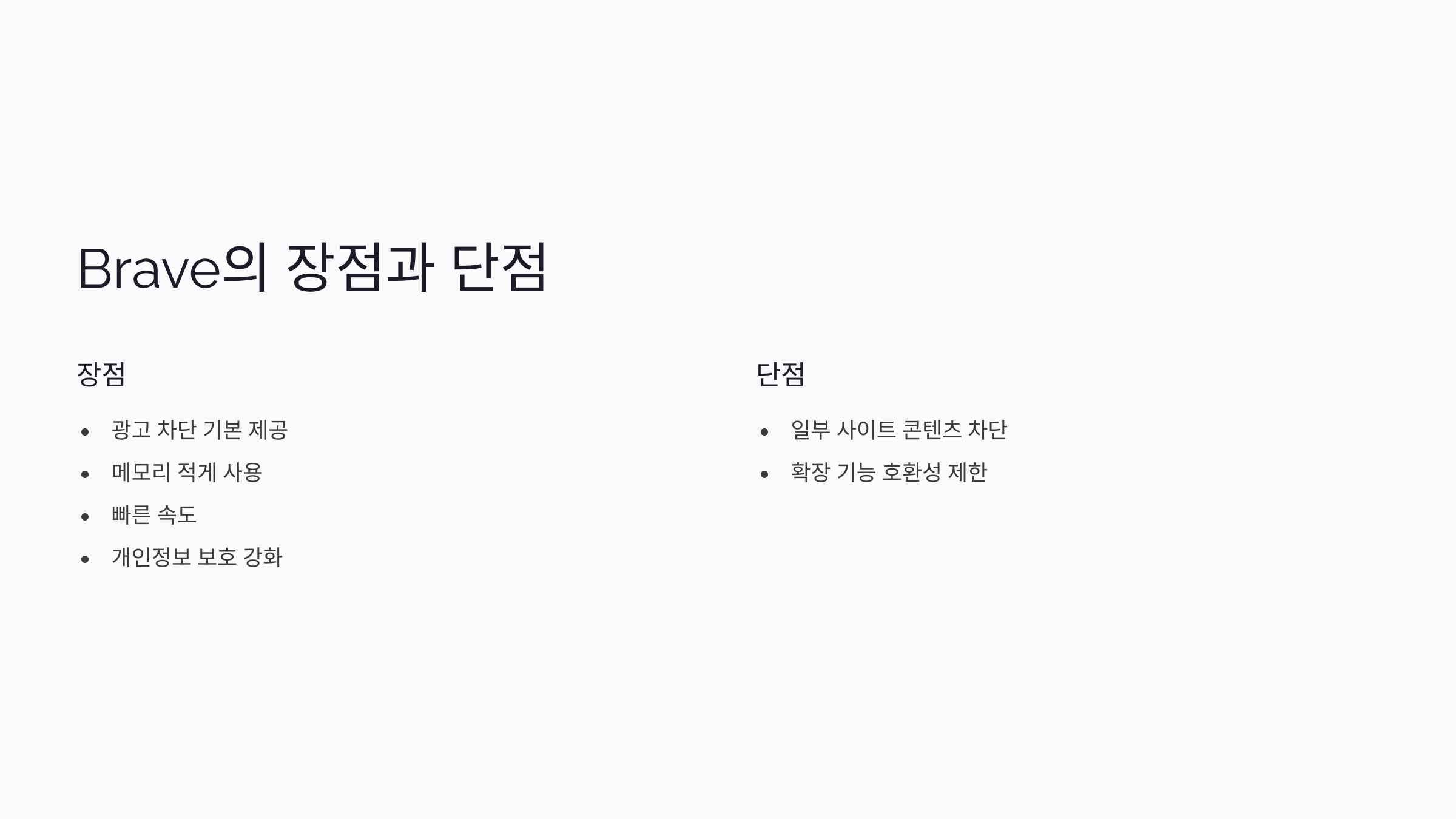 | 단점 | 일부 사이트 콘텐츠 차단, 확장 기능 호환성 제한 |