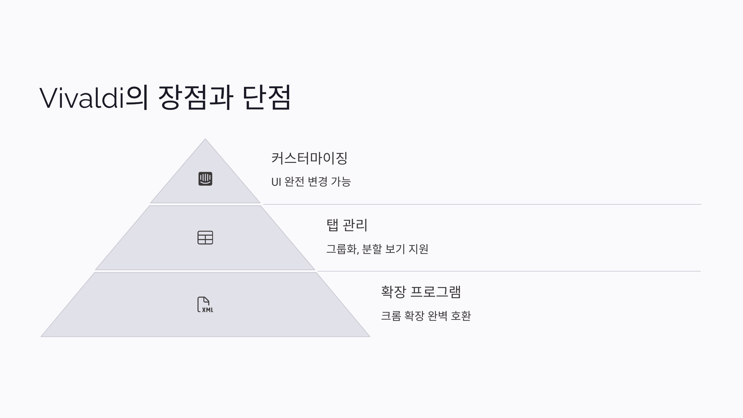 | Vivaldi | 탭 그룹화, UI 애니메이션 OFF | 메모리 관리 최적화 |