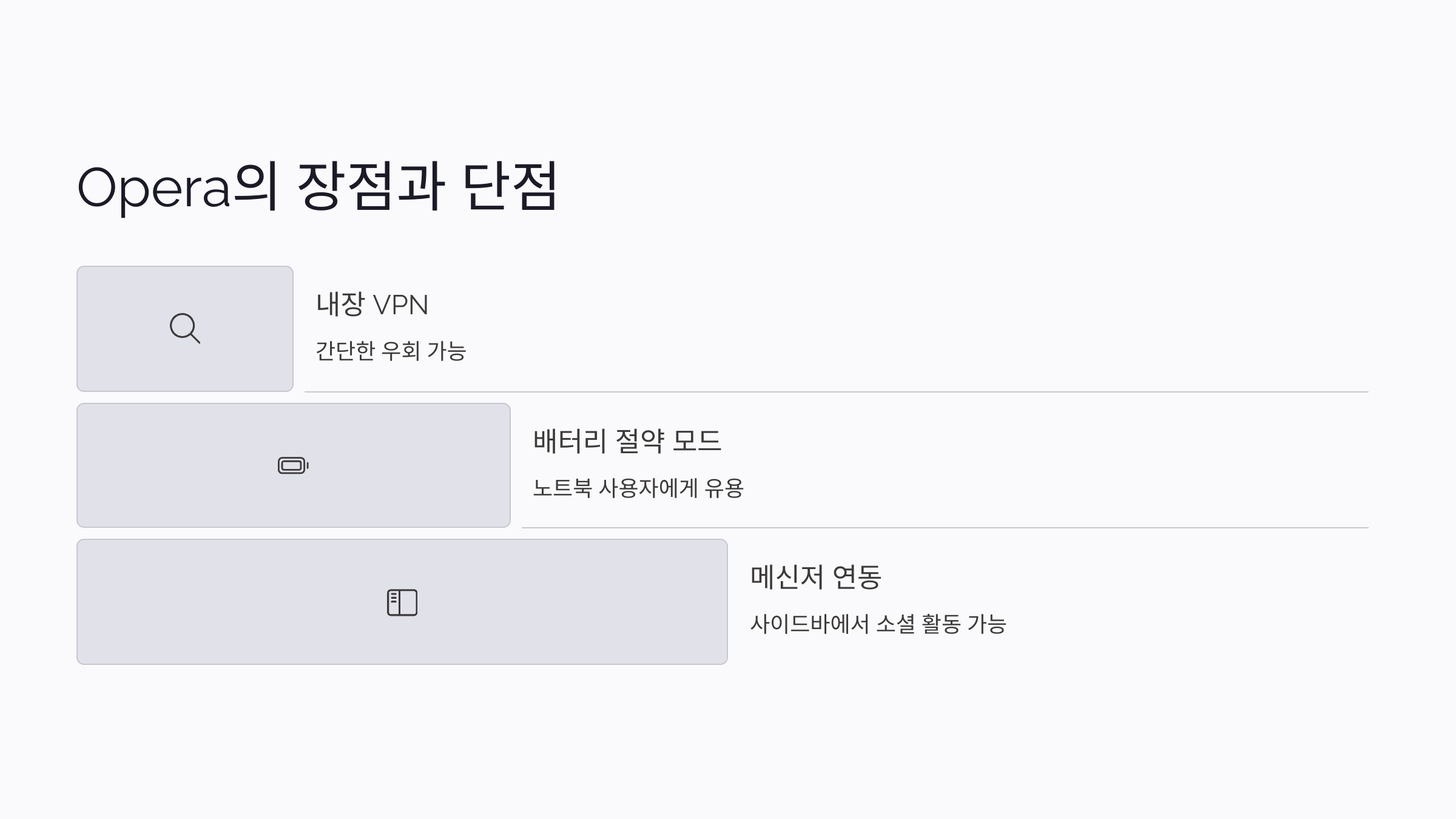 | 장점 | 내장 VPN, 배터리 절약 모드, 빠른 속도 |