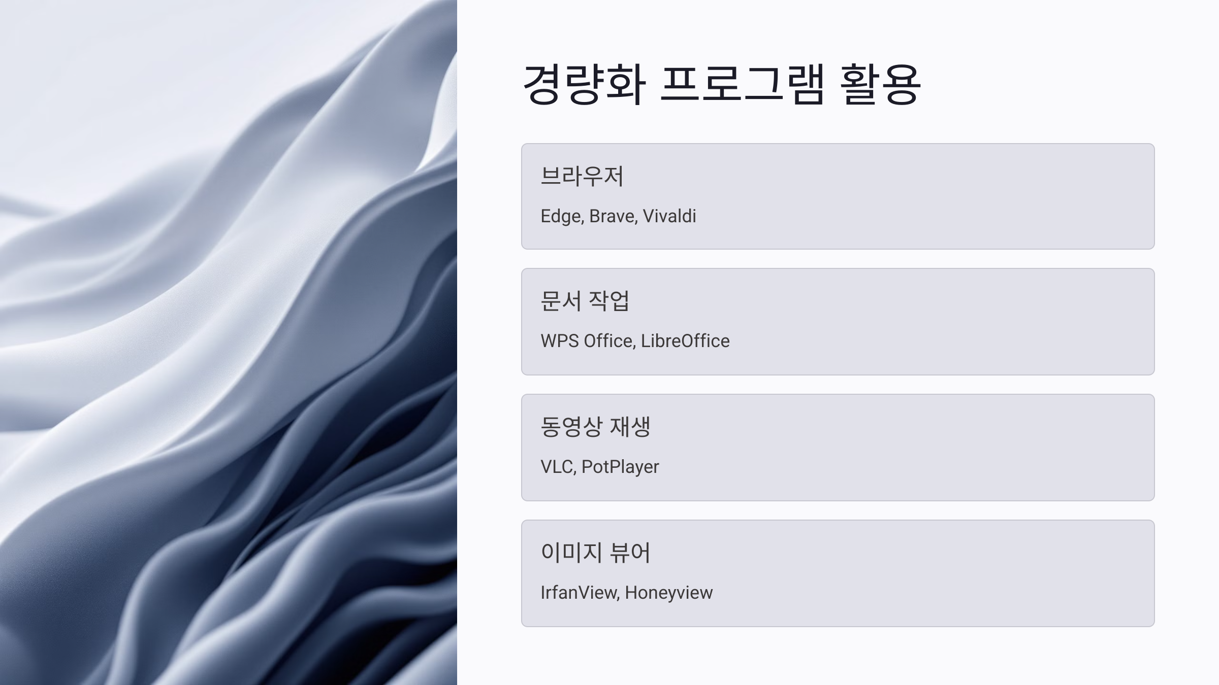| 이미지 뷰어 | IrfanView, Honeyview | 초저용량 |