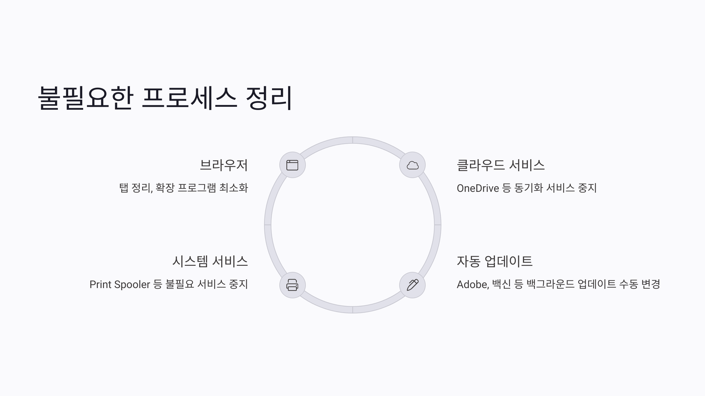 4GB RAM 환경에서는 백그라운드에서 돌아가는 수많은 프로세스들이 성능을 갉아먹어요. 눈에 보이지 않지만, RAM을 지속적으로 점유하고 있기 때문에 불필요한 항목들을 선별해 꺼주는 게 정말 중요해요.