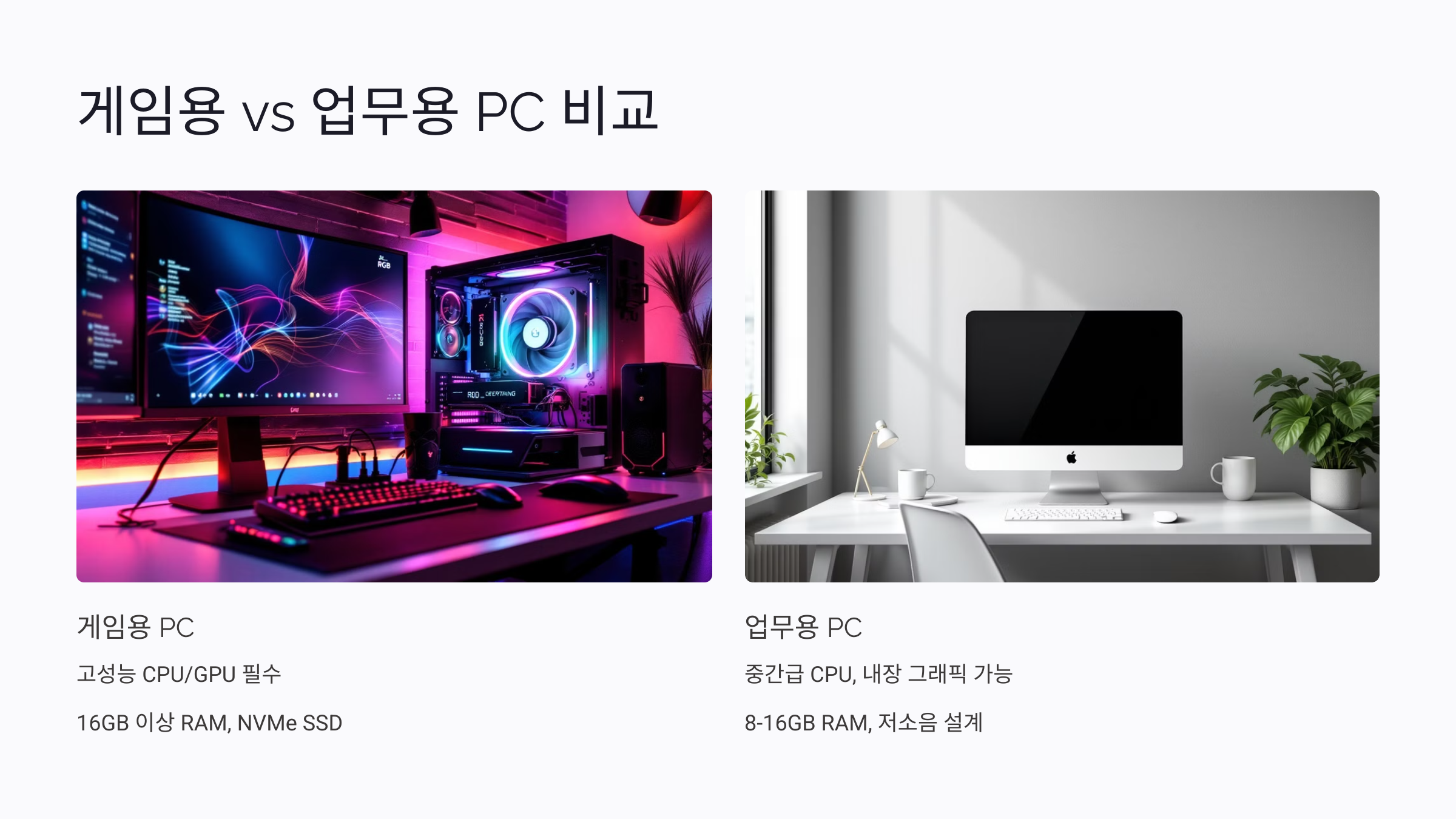 게임용 PC는 고사양 부품이 필수지만, 업무용 PC는 안정성과 효율성이 더 중요해요.