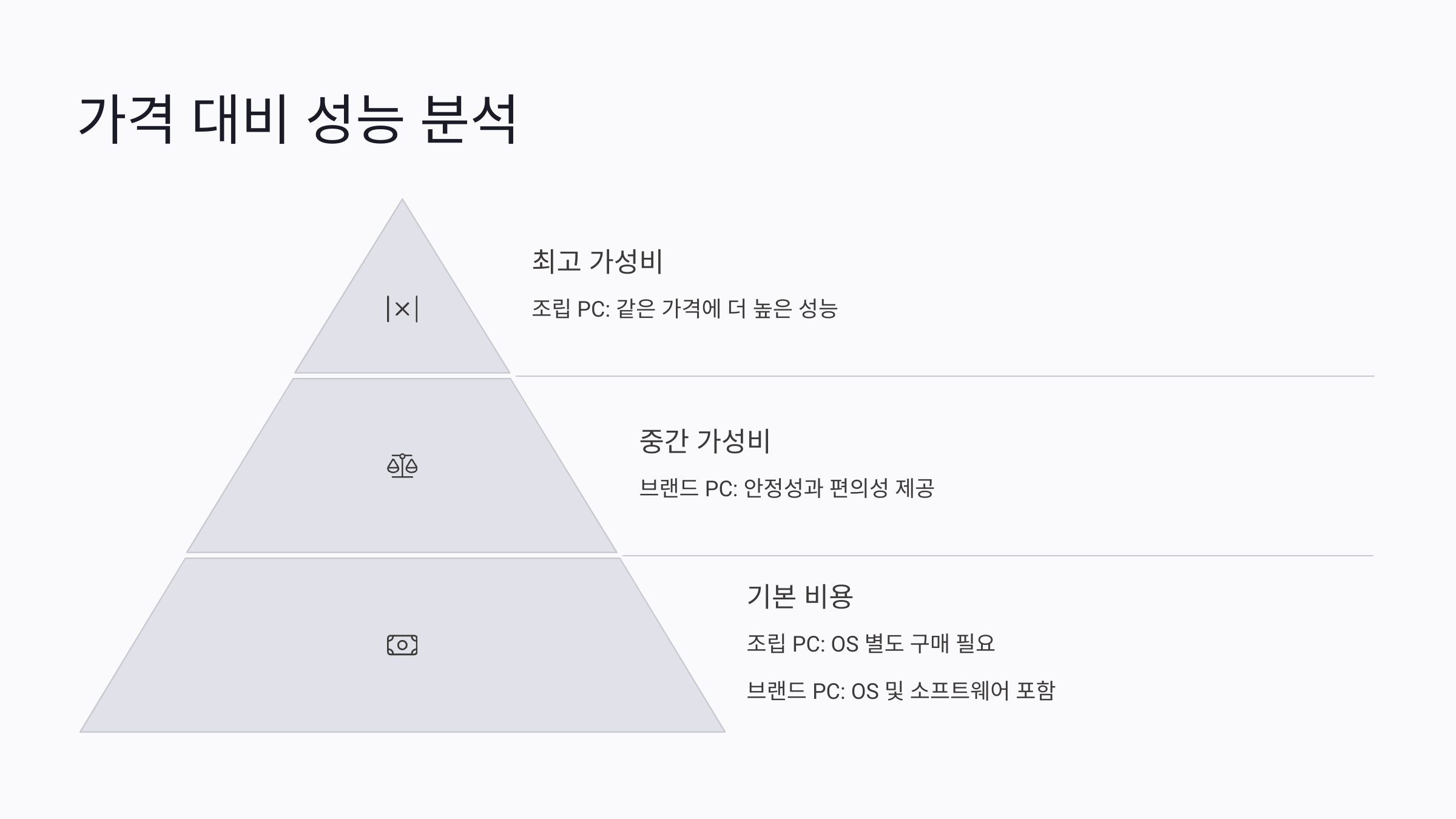 가격 대비 성능만 따진다면 조립 PC가 압도적으로 유리하지만, 브랜드 PC는 안정성과 편의성을 제공해요.