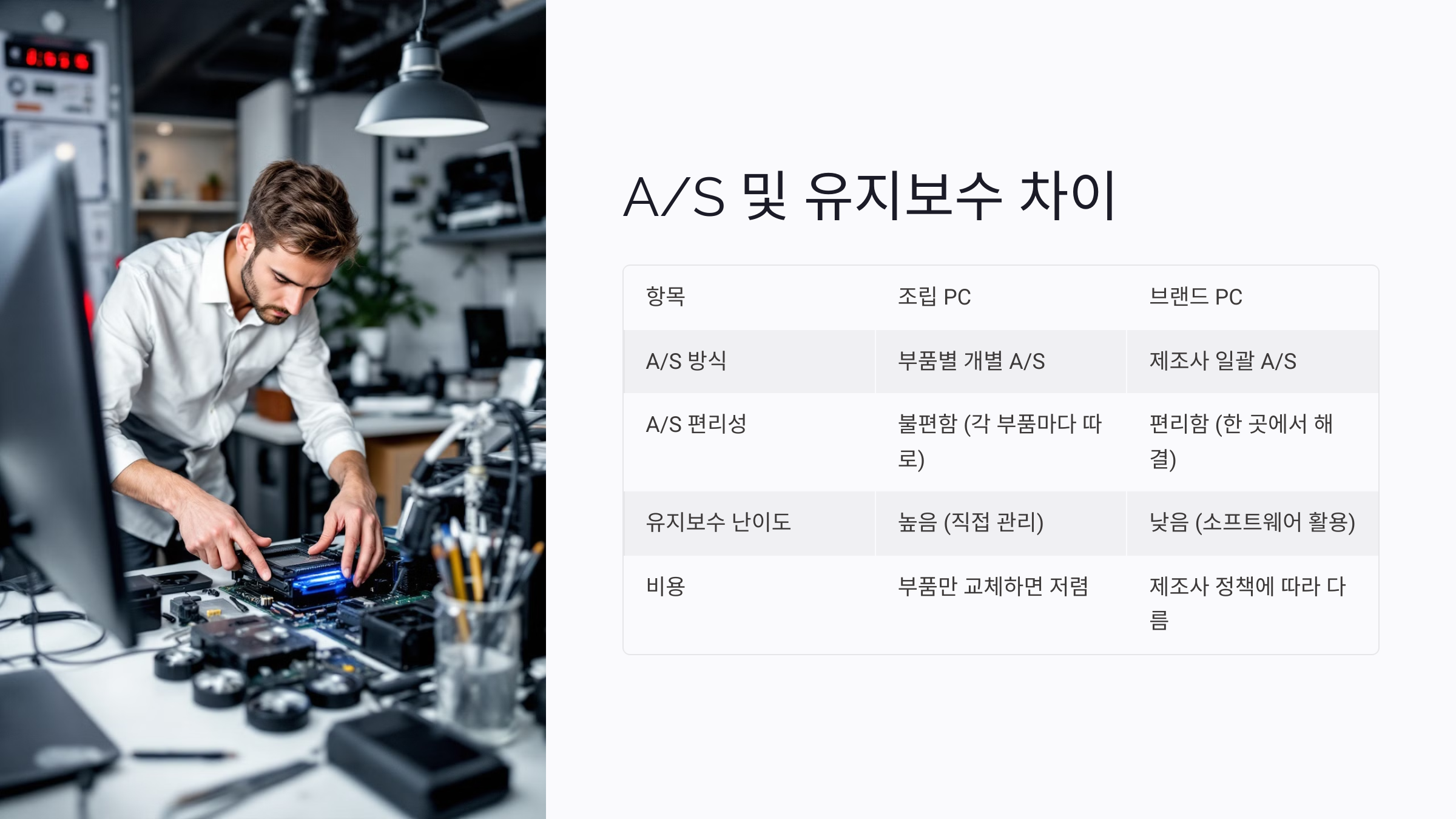 조립 PC는 A/S가 번거롭지만 유지보수 비용이 저렴한 반면, 브랜드 PC는 편리하지만 부품 교체 비용이 비쌀 수 있어요.