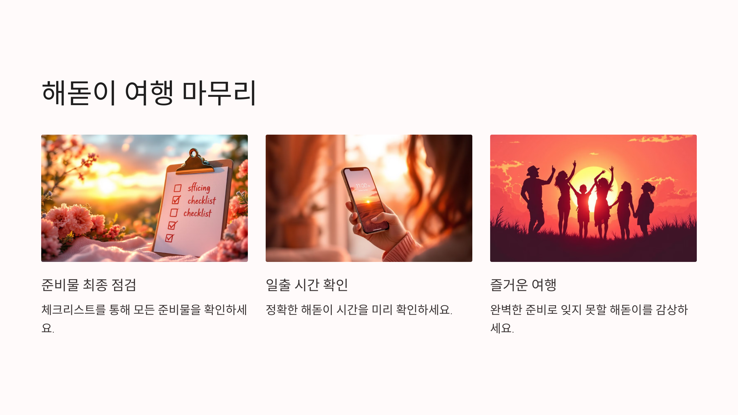 해돋이 여행을 계획 중이신가요? 일출은 그 자체로 놀라운 자연의 선물입니다. 하지만 준비 없이 떠난다면 불편함을 겪을 수 있습니다. 이 글에서는 해돋이 여행을 완벽히 즐길 수 있도록 필수 준비물 체크리스트를 제공합니다.