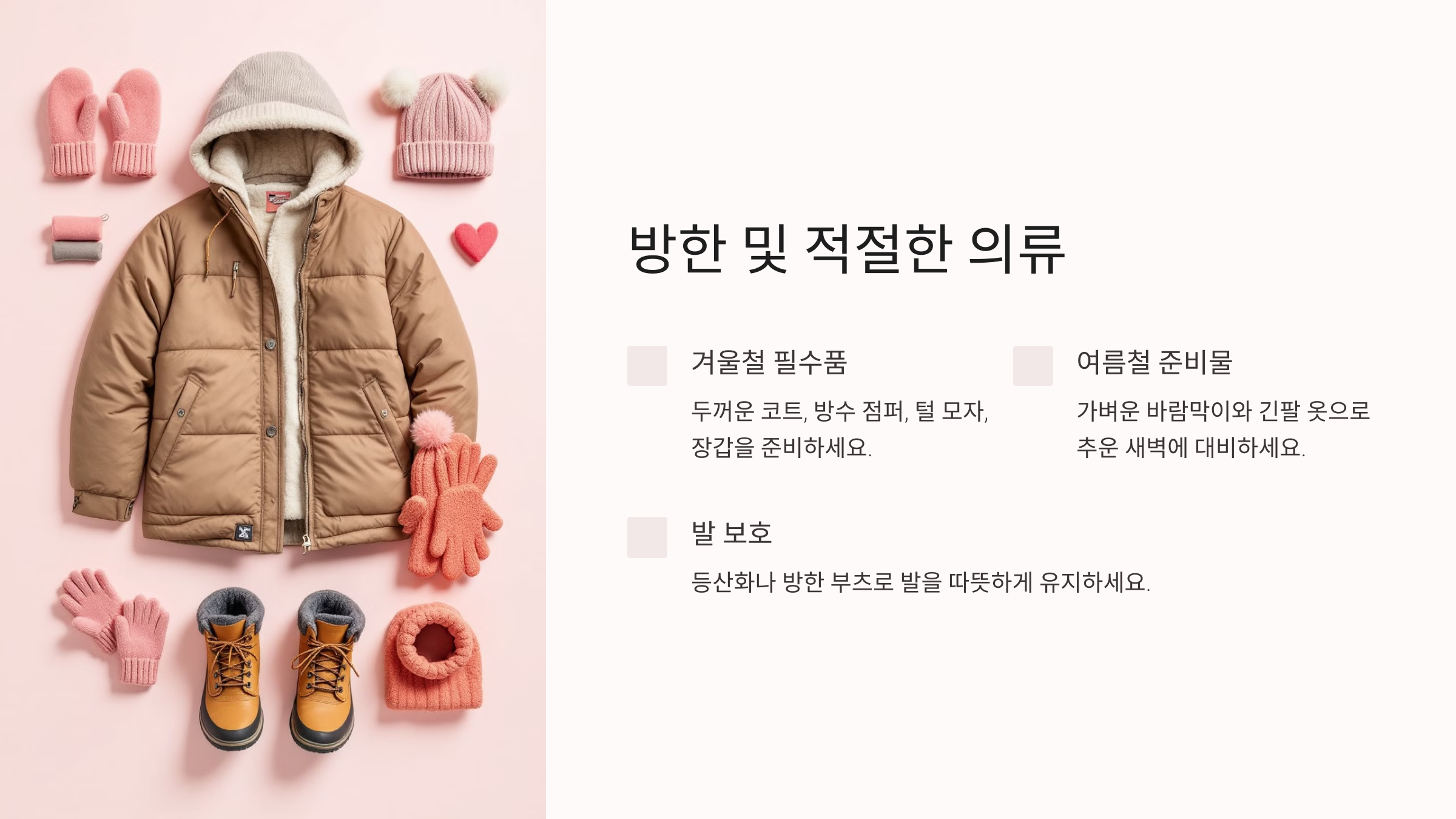 여름에는 가벼운 바람막이와 긴팔 옷을 준비해 추운 새벽을 대비하세요.