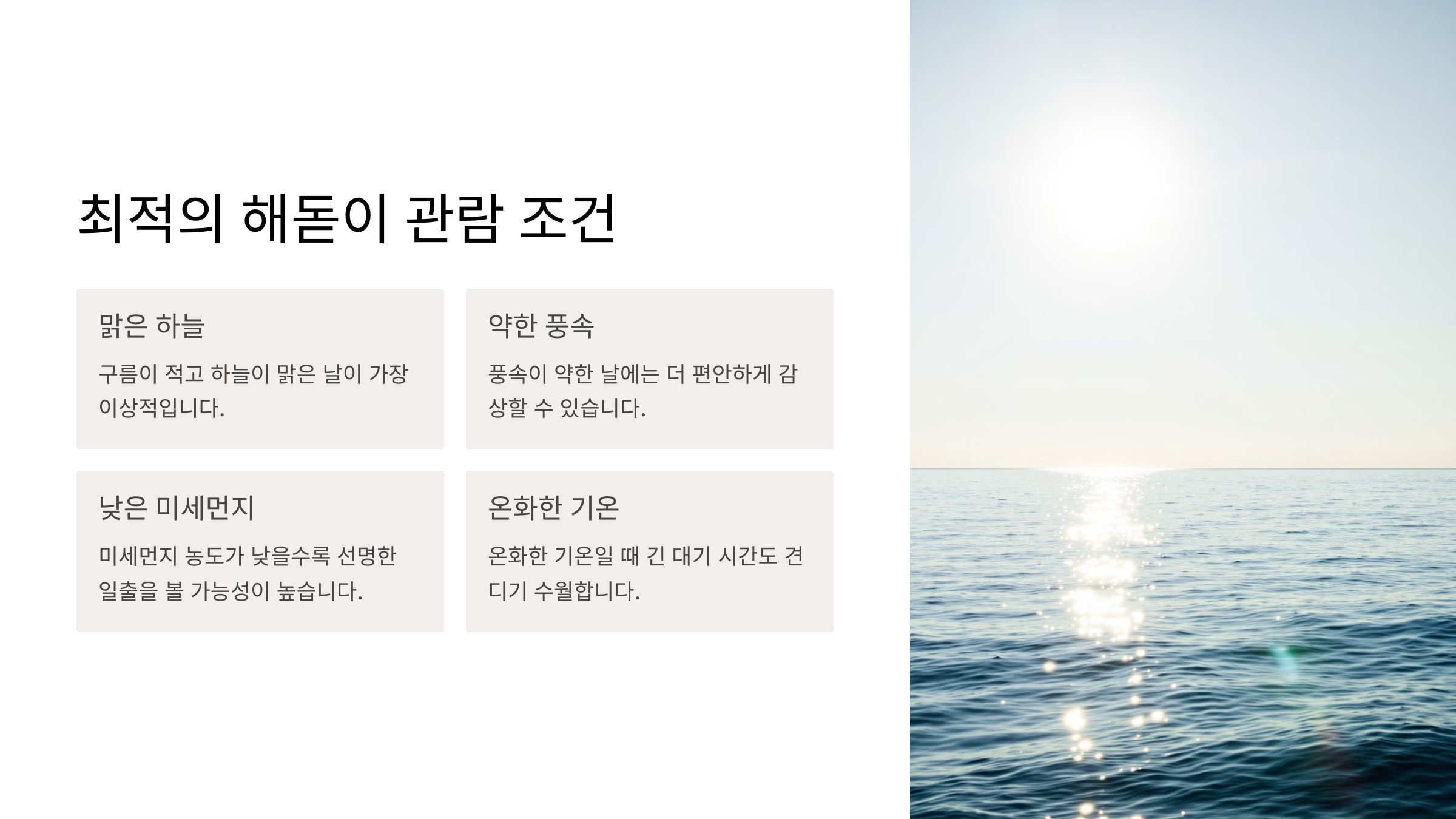 겨울에는 낮 시간이 짧아 해돋이를 감상하기 쉬운 환경이 조성됩니다.