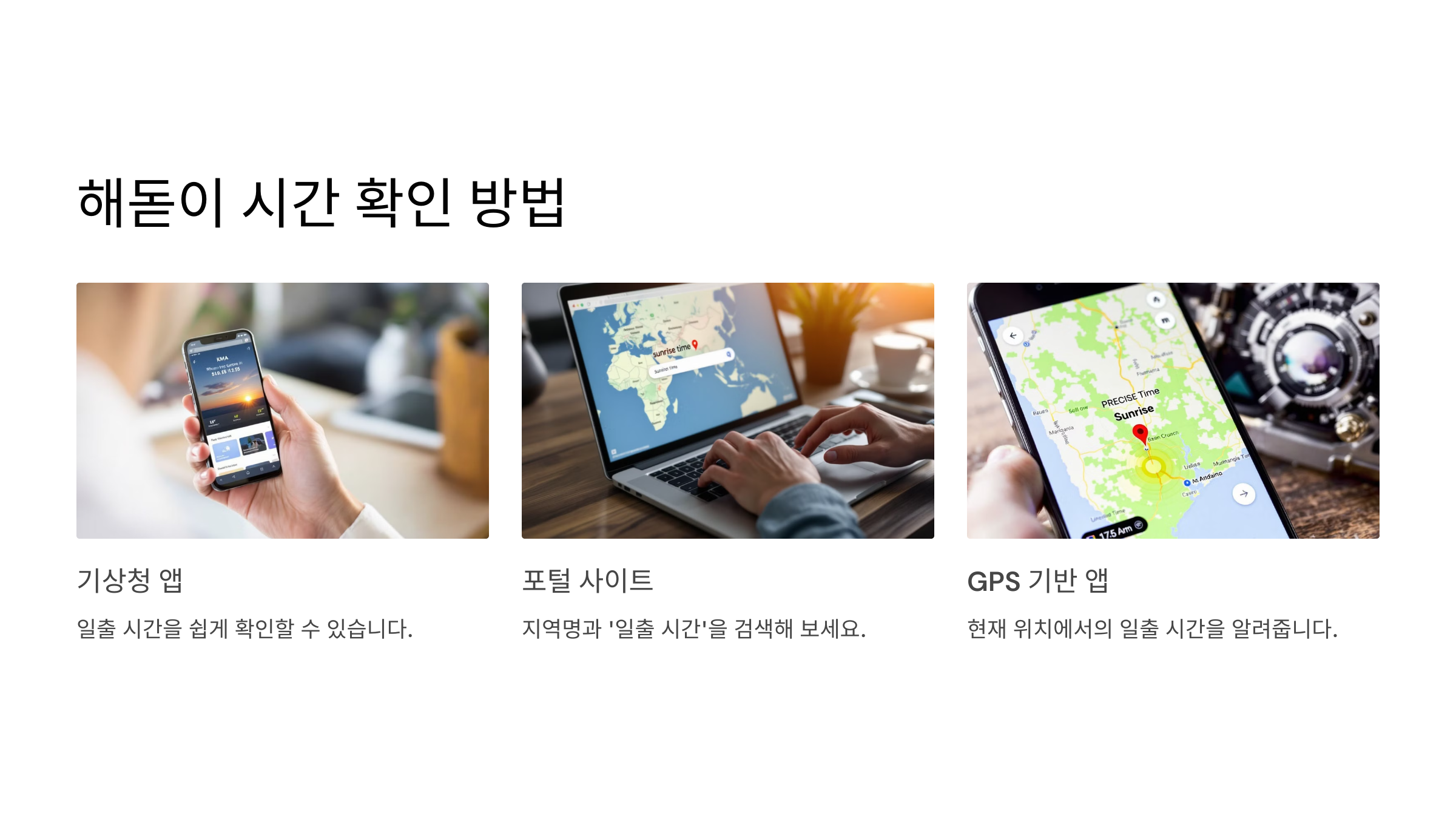 네이버나 구글과 같은 포털 사이트에서 지역명과 '일출 시간'을 검색해 보세요.