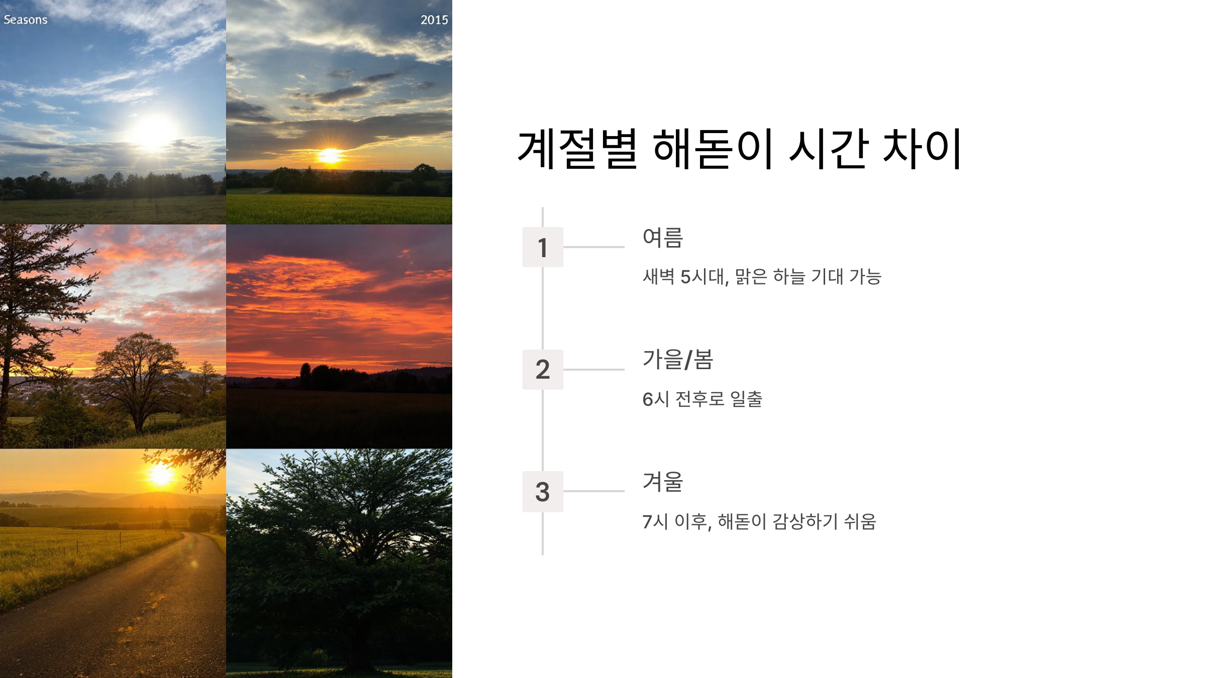 계절에 따라 일출 시간은 크게 변동됩니다.