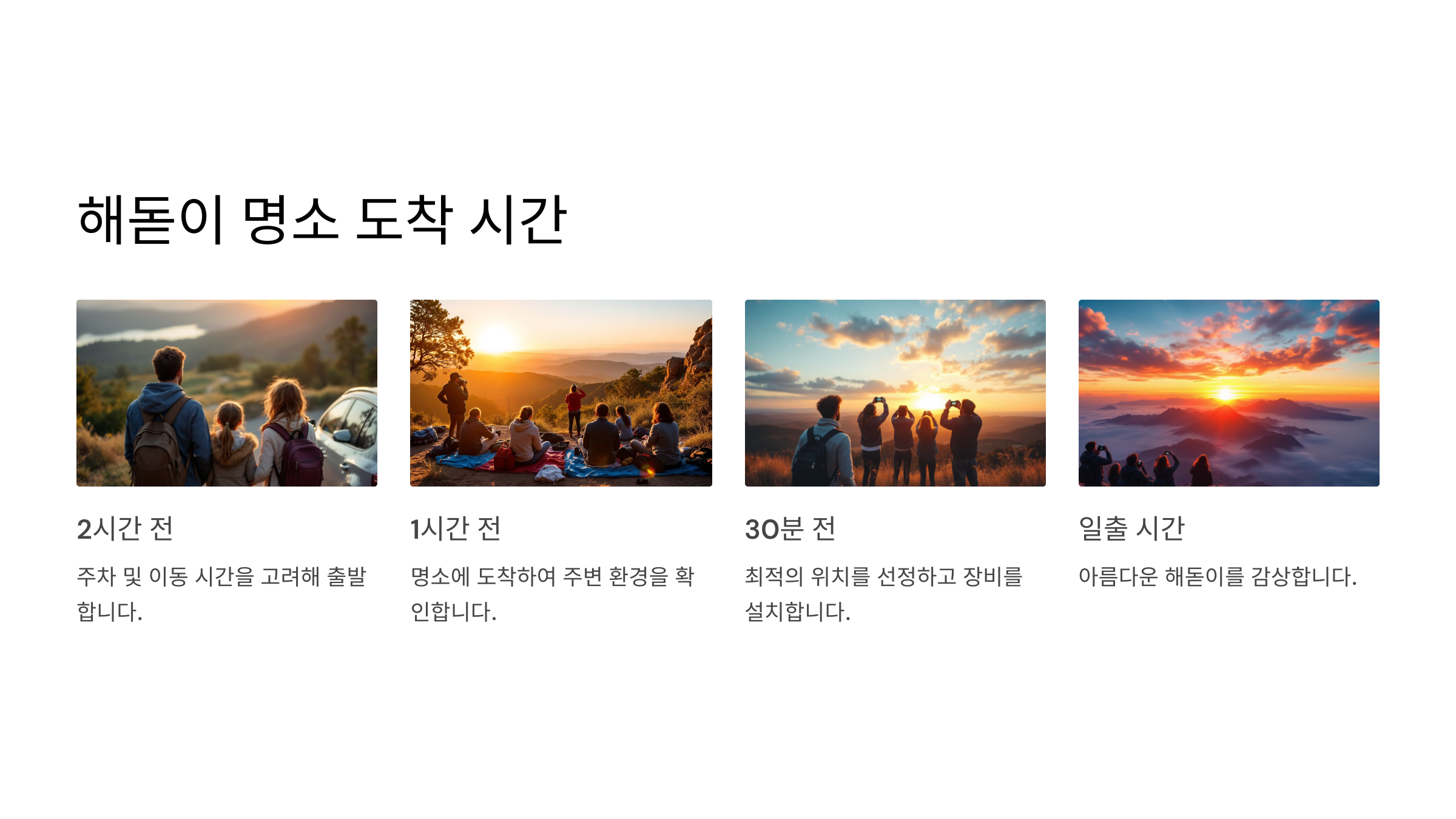 해돋이 시간은 지역마다 다르므로 명소의 정확한 시간을 확인하세요.