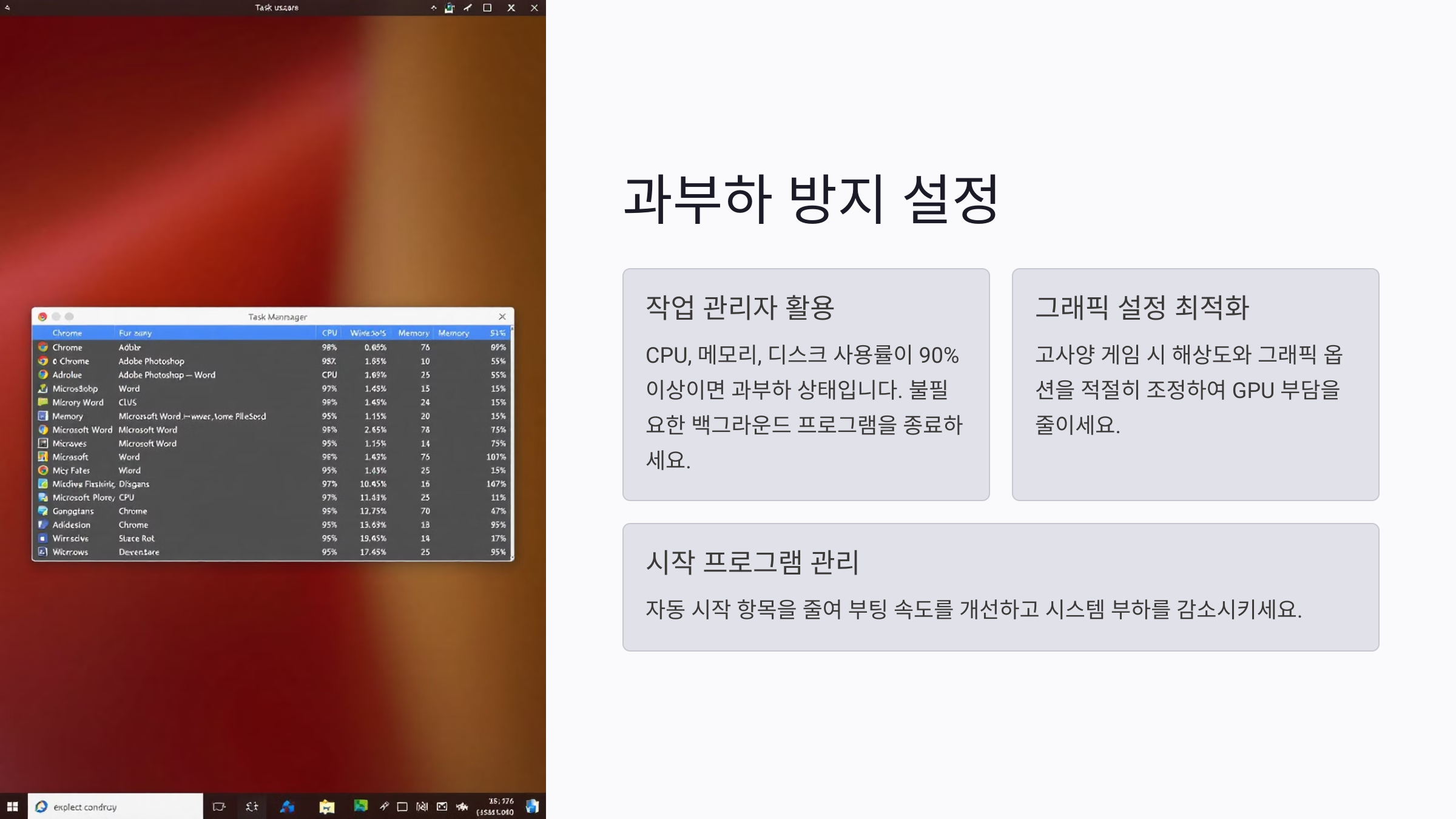 과부하를 방지하려면 먼저 작업 관리자를 통해 현재 시스템 자원을 확인해야 해요. CPU, 메모리, 디스크 사용률이 90% 이상으로 지속되면 과부하 상태일 가능성이 커요. 불필요한 백그라운드 프로그램을 종료하고, 자동 시작 항목을 줄이는 것이 좋아요.