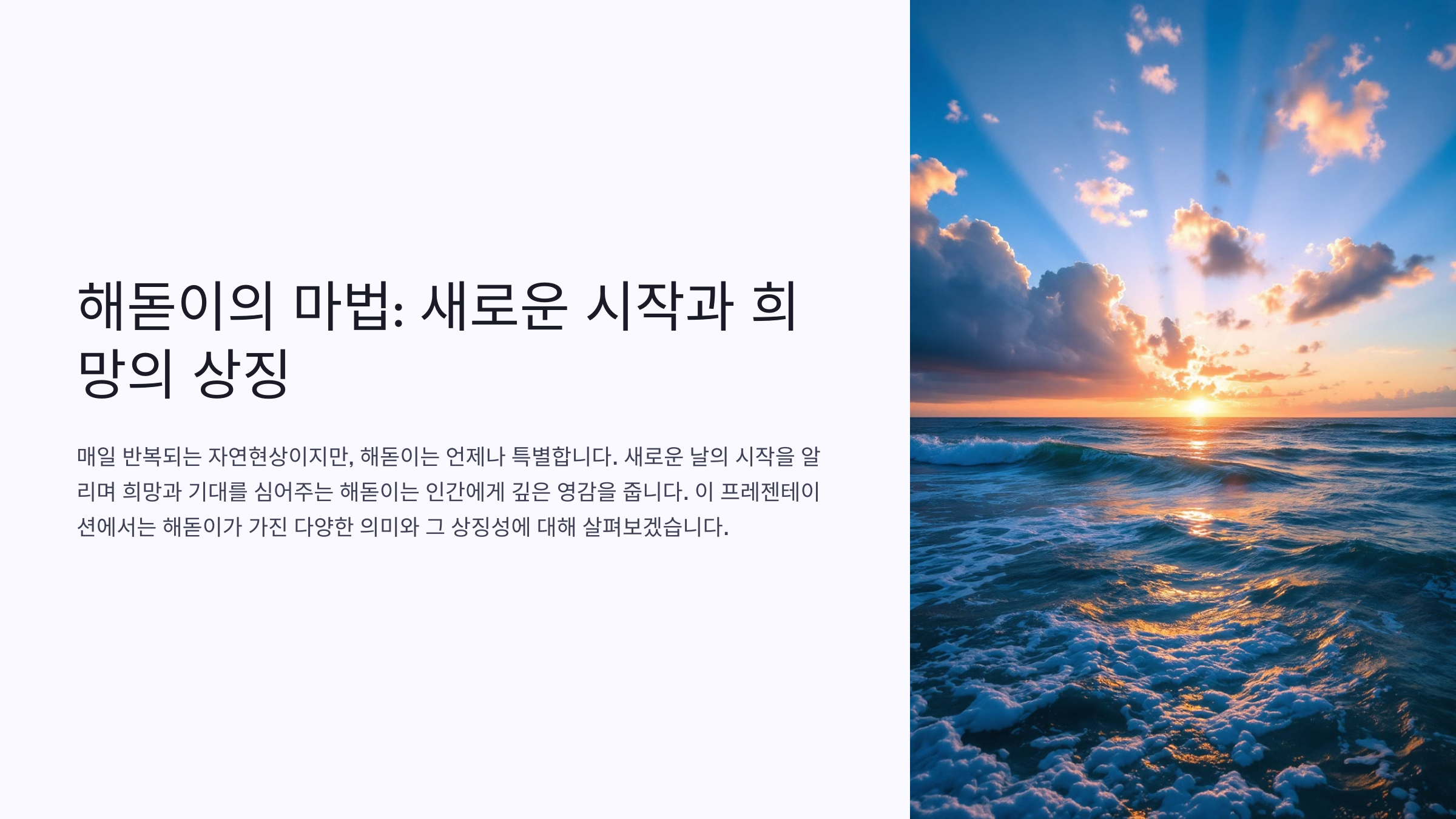 해돋이는 매일 반복되는 자연현상이지만, 그 순간은 언제나 특별합니다. 새로운 날의 시작을 알리며 희망과 기대를 심어주는 해돋이는 인간에게 깊은 영감을 줍니다. 이번 글에서는 해돋이가 가진 다양한 의미와 그 상징성에 대해 살펴보겠습니다.
