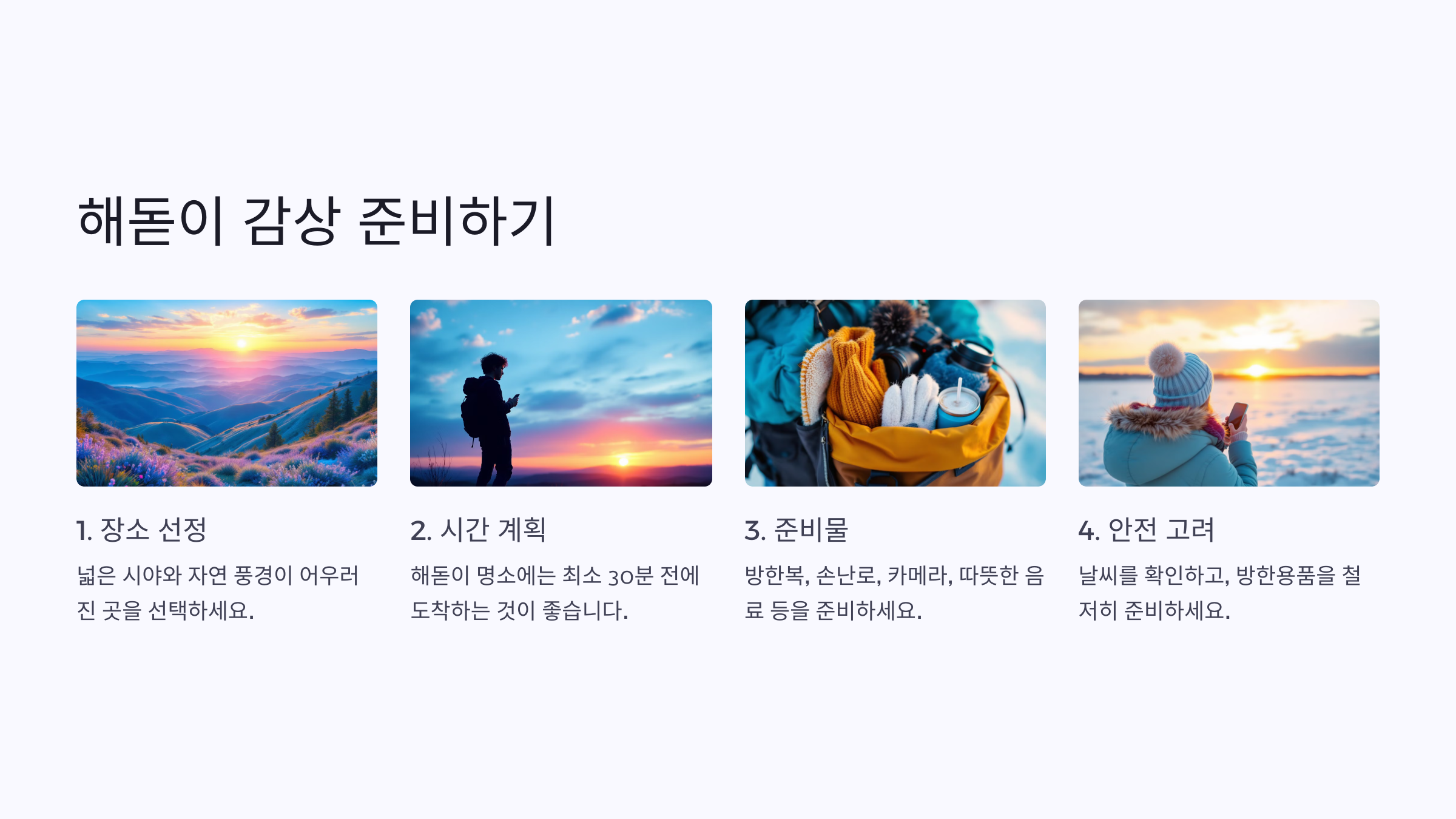 📋 목차1. 해돋이 명소에 일찍 도착하기2. 날씨와 기온 확인3. 필수 안전 장비 준비4. 적절한 의류 착용5. 교통 상황 및 주차 정보 확인6. 수분과 간단한 음식 준비7. 주변 사람과 자연 환경 존중