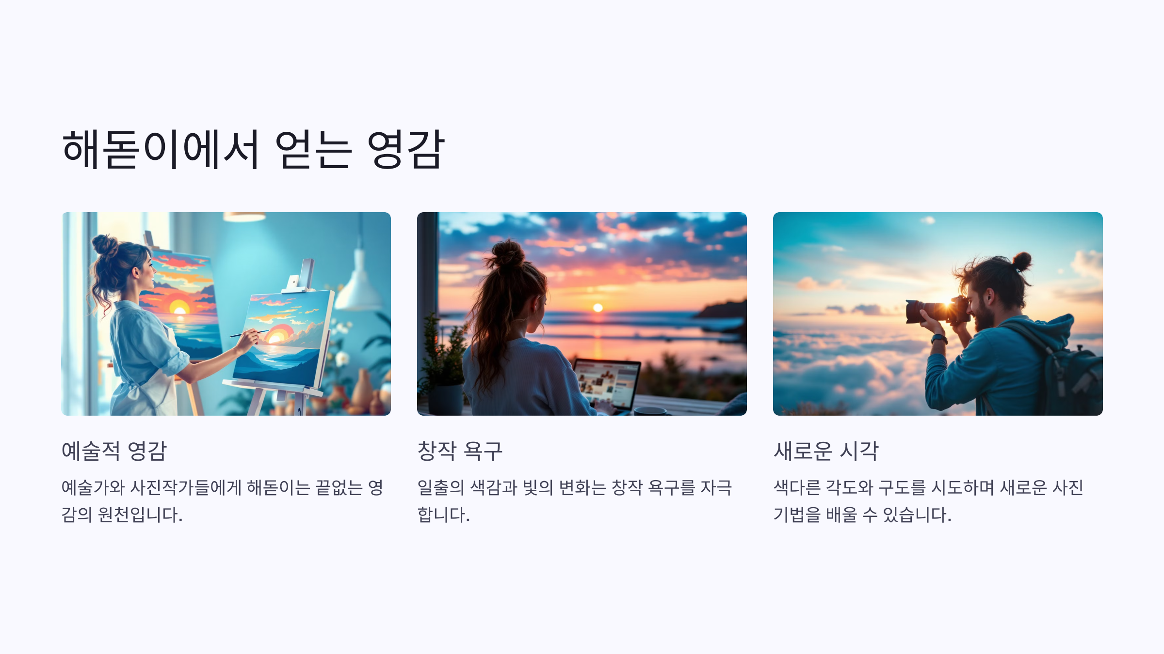 일출의 색감과 빛의 변화는 창작 욕구를 자극합니다.