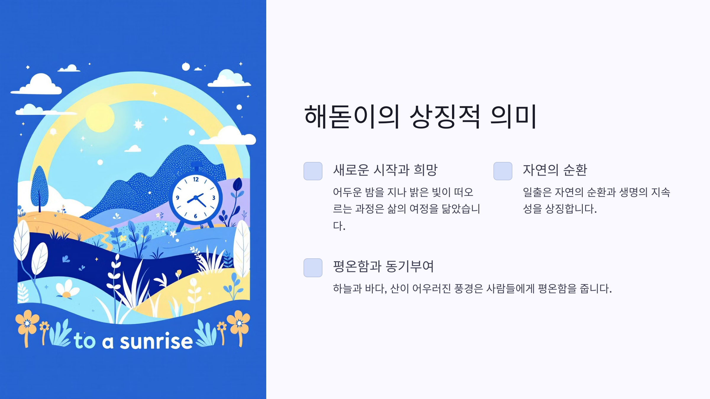 일출은 자연의 순환과 생명의 지속성을 상징합니다.