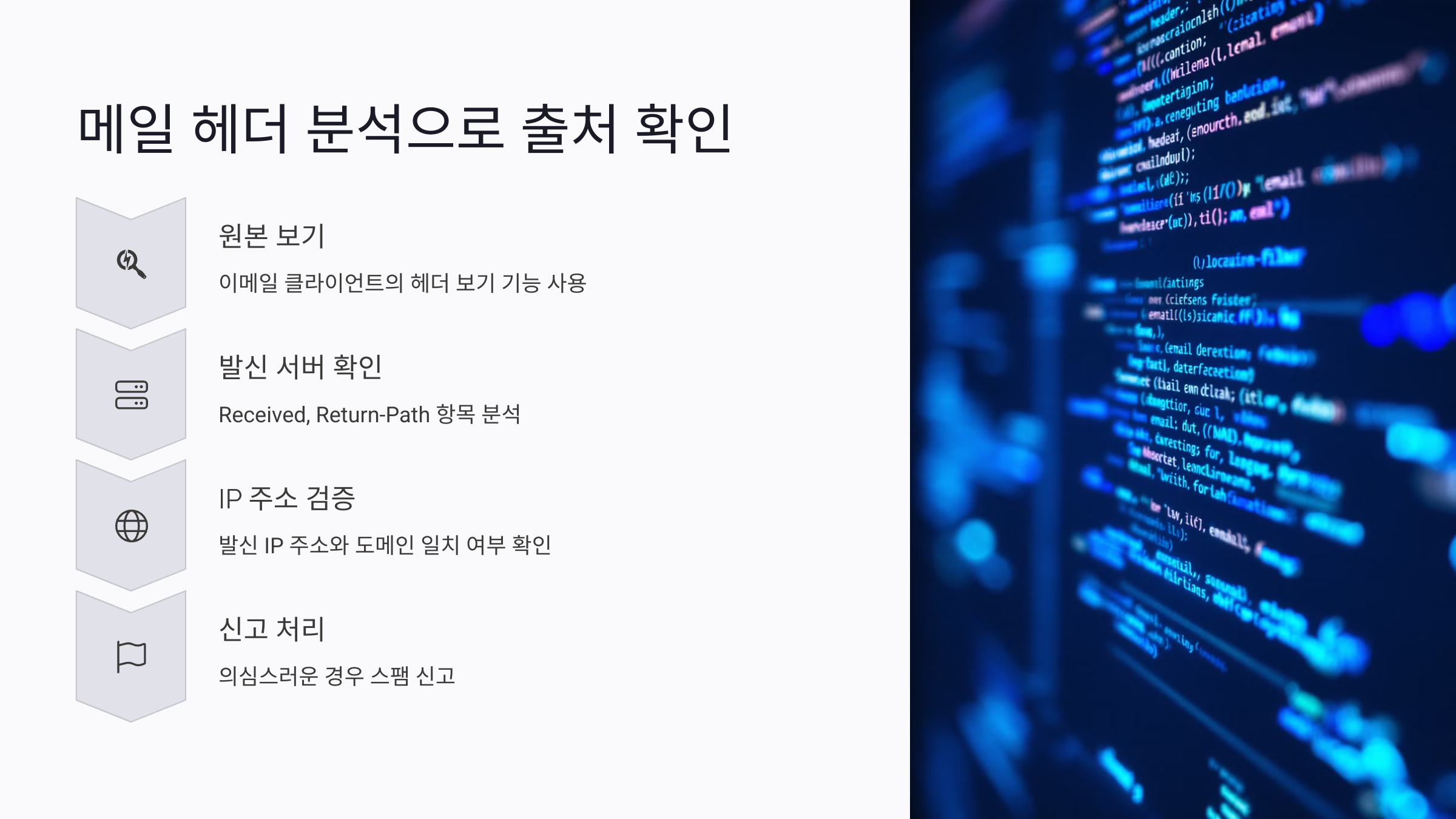 대부분의 이메일 클라이언트에서는 "원본 보기" 또는 "헤더 보기" 기능을 통해 메일 헤더를 확인할 수 있어요. 헤더에서 "Received:"나 "Return-Path:" 부분을 유심히 보면 발신 서버의 IP 주소와 도메인을 알 수 있어요.