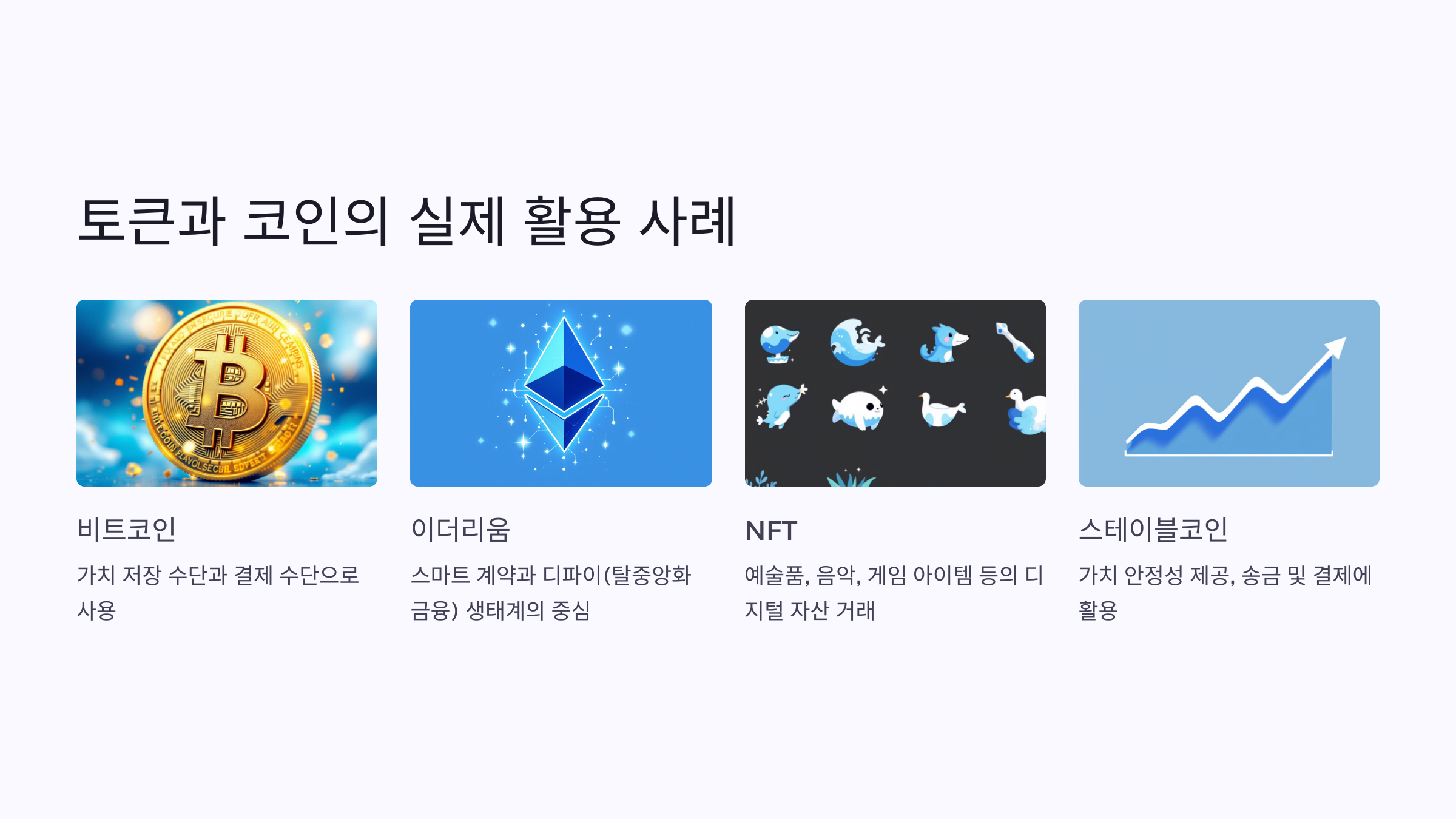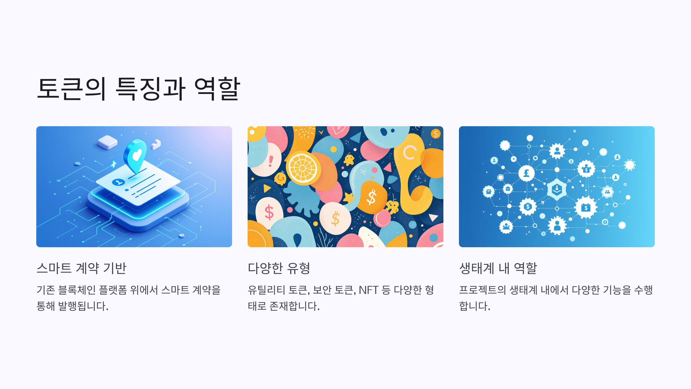 토큰은 특정 프로젝트의 서비스나 플랫폼 내에서 활용됩니다. 예: NFT, 디파이 토큰.