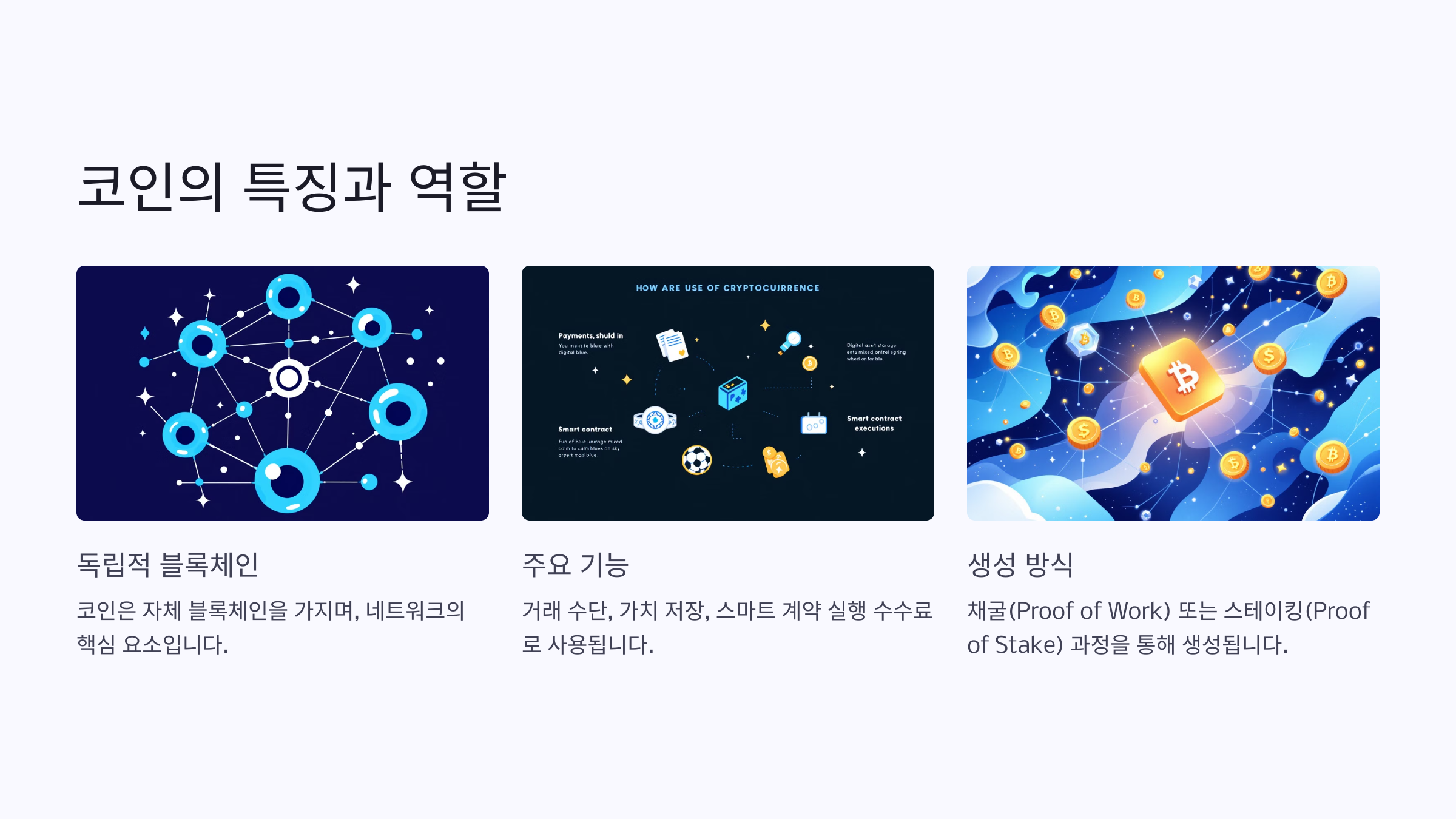 코인은 독립적인 블록체인을 기반으로 만들어진 디지털 자산입니다. 예: 비트코인, 이더리움.