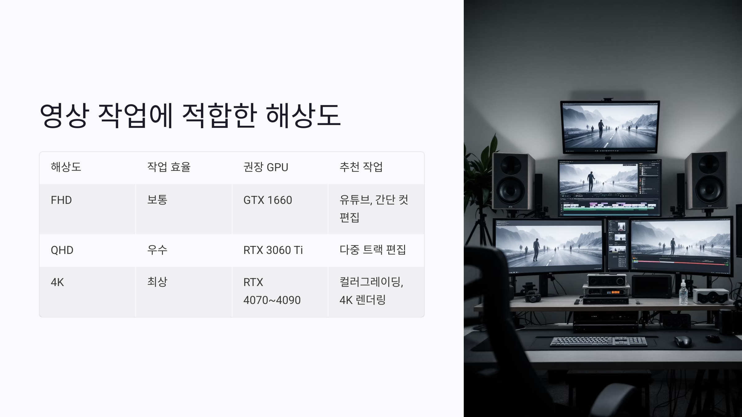 | 해상도 | 작업 효율 | 권장 GPU | 추천 작업 |