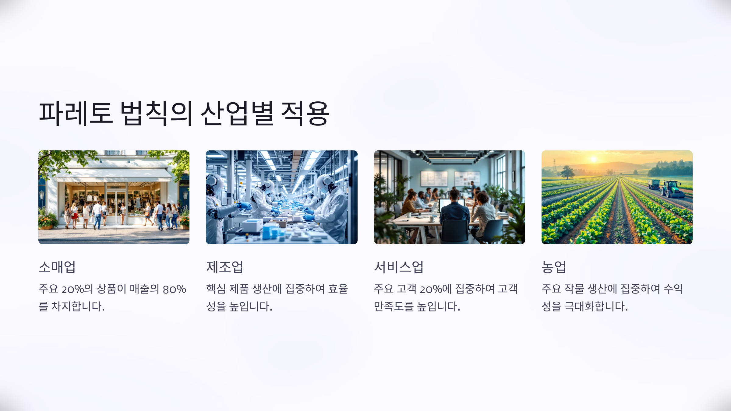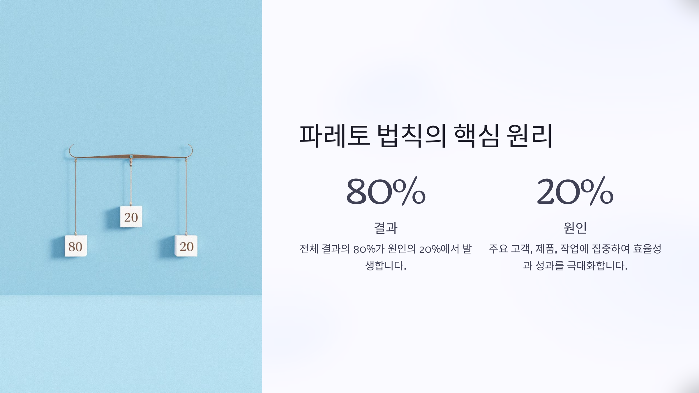 파레토 법칙(80/20 법칙)은 전 세계적으로 성공한 많은 기업에서 성과를 극대화하기 위해 활용되는 전략입니다. 핵심 고객, 주요 제품, 그리고 효과적인 프로세스에 집중한 사례를 통해 어떻게 이 법칙이 기업의 성과를 크게 높였는지 알아보세요.