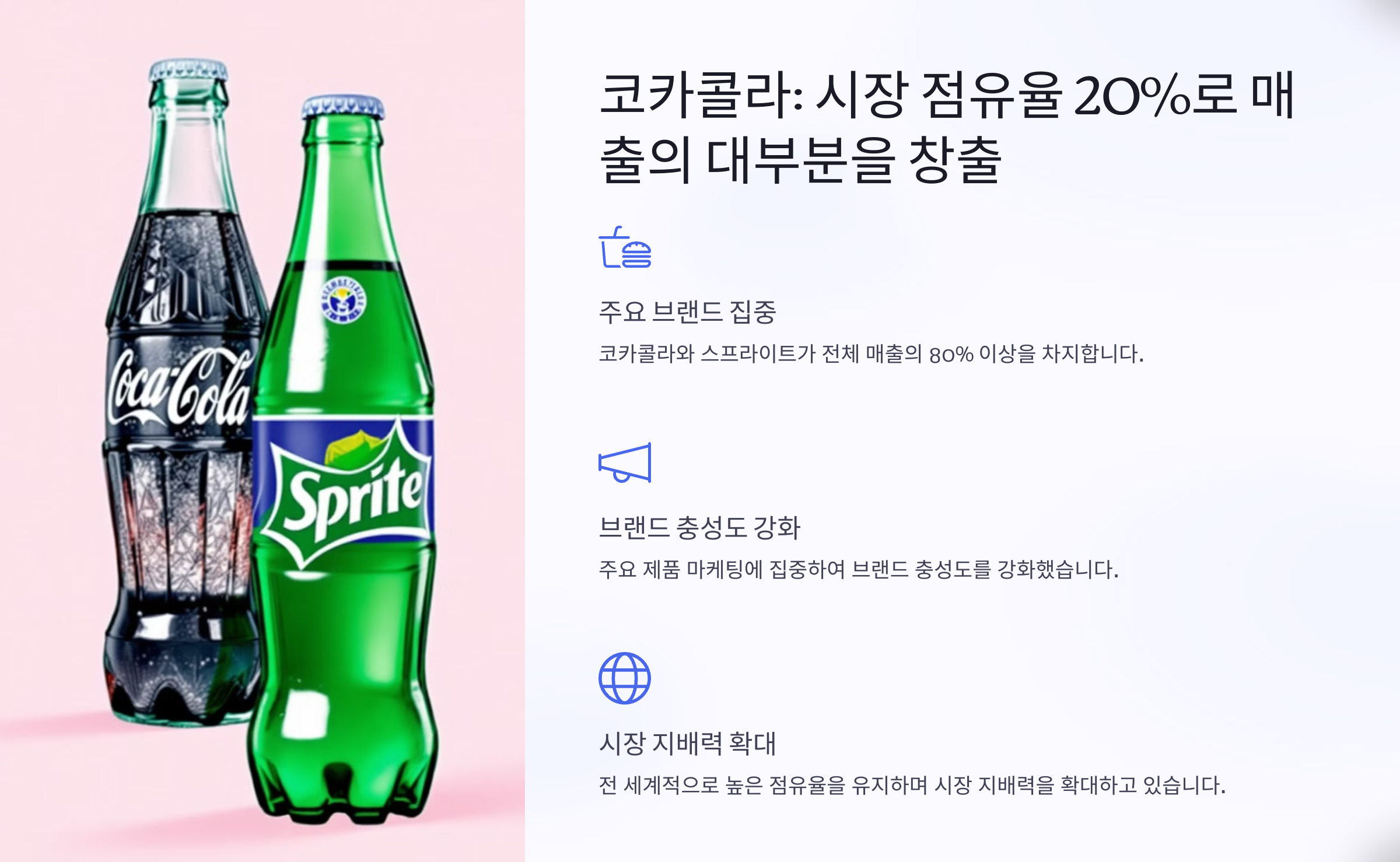 코카콜라(Coca-Cola): 시장 점유율 20%로 매출의 대부분을 창출