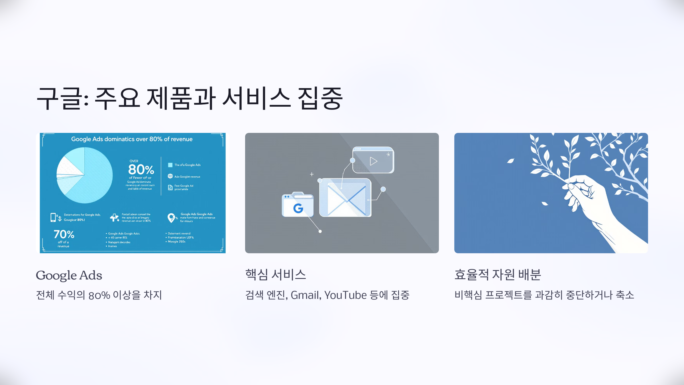 구글은 비핵심 프로젝트를 과감히 중단하거나 축소하여 자원을 절약합니다.
