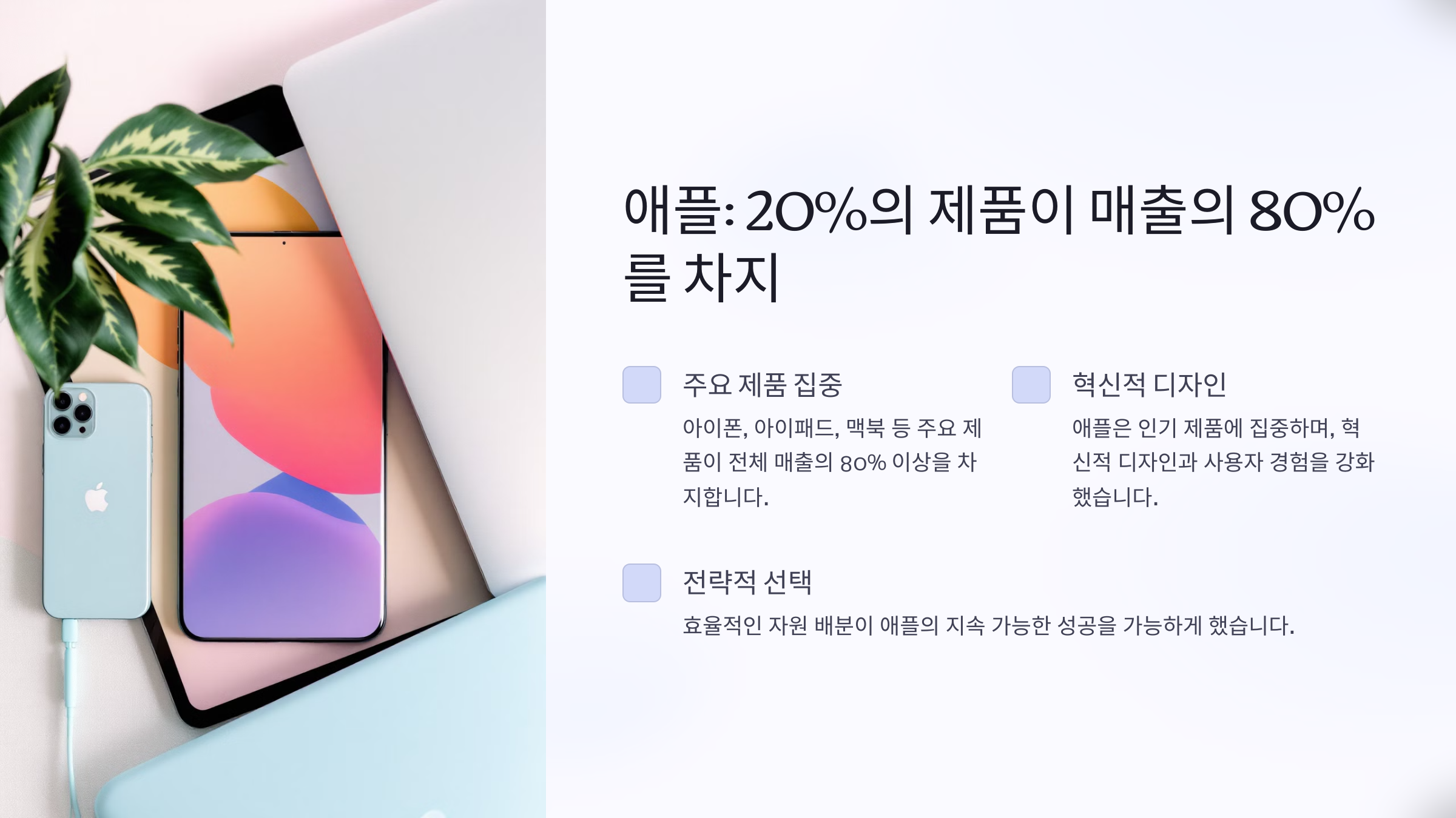 애플의 성공은 파레토 법칙의 실질적 효과를 입증하는 강력한 사례입니다.