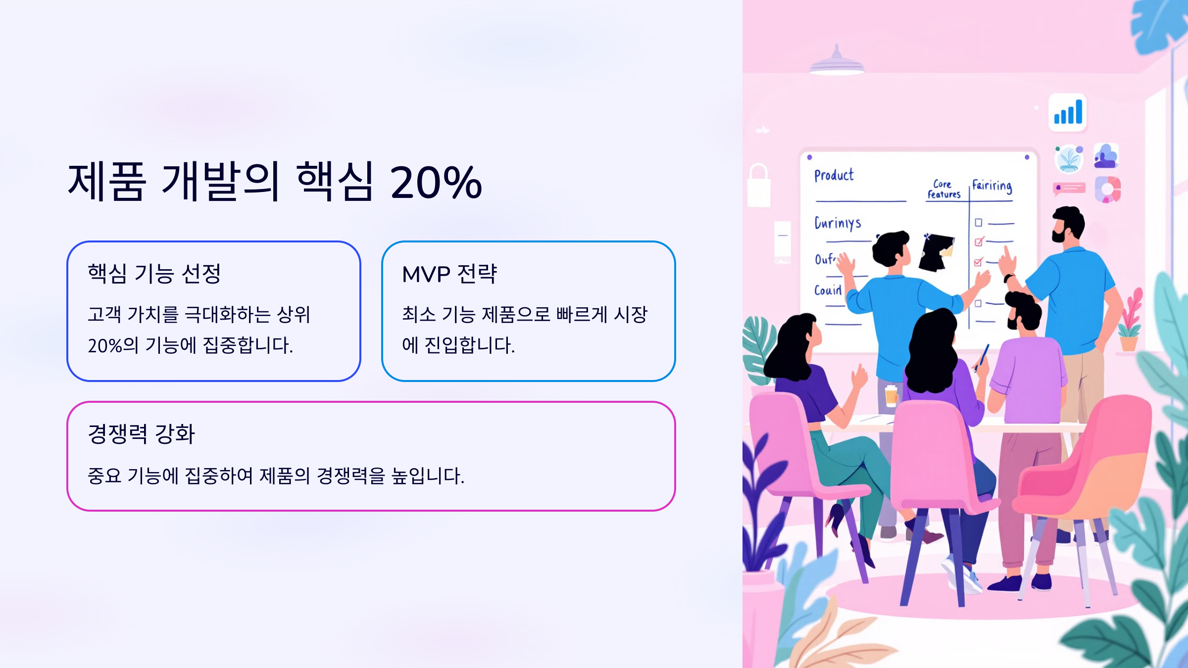 전체 기능 중 고객 가치를 극대화하는 상위 20%의 기능에 집중하세요.