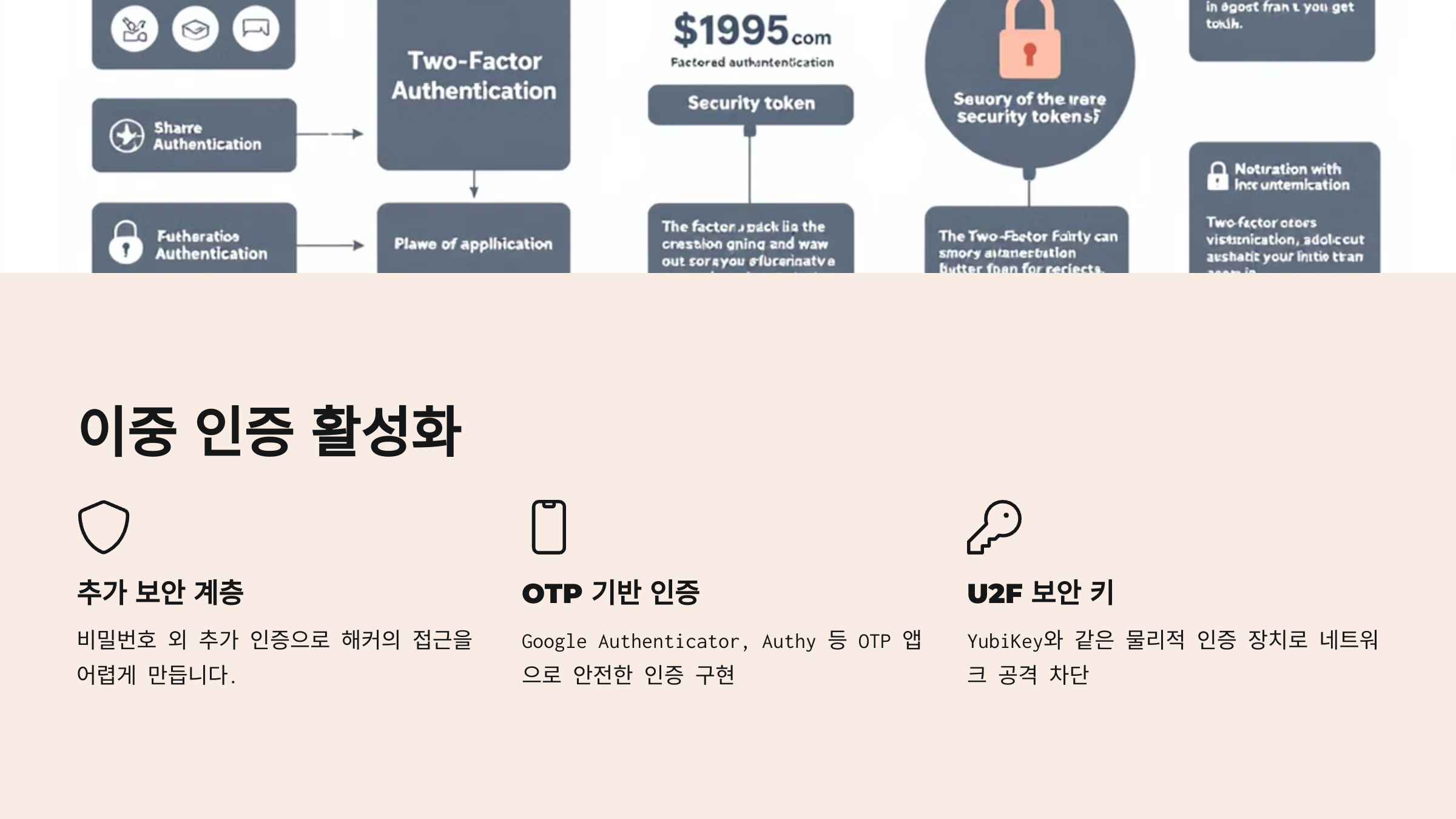 OTP 기반 인증: Google Authenticator, Authy와 같은 앱은 일회용 비밀번호(OTP)를 생성하여 계정에 로그인할 때 추가적인 인증 단계를 제공합니다. 이는 고도로 안전한 인증 방식으로, SMS 기반 인증보다 보안성이 높습니다.