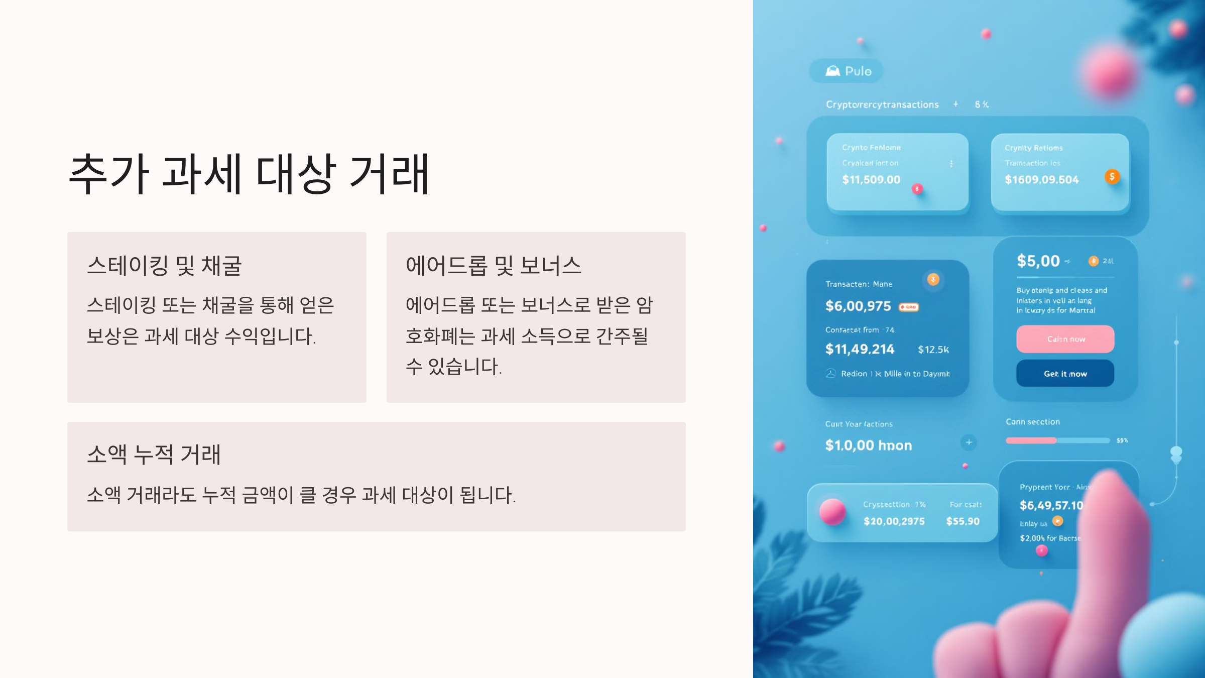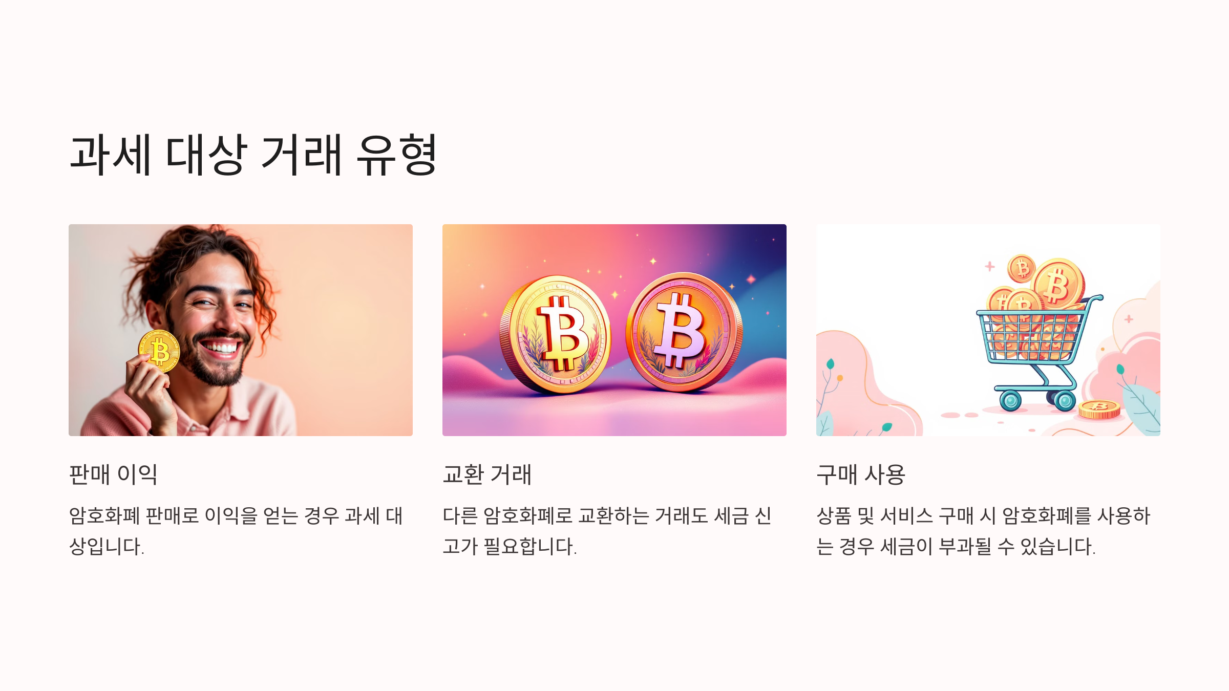 암호화폐의 유형과 용도(투자, 결제 등)에 따라 세금 적용이 다릅니다.