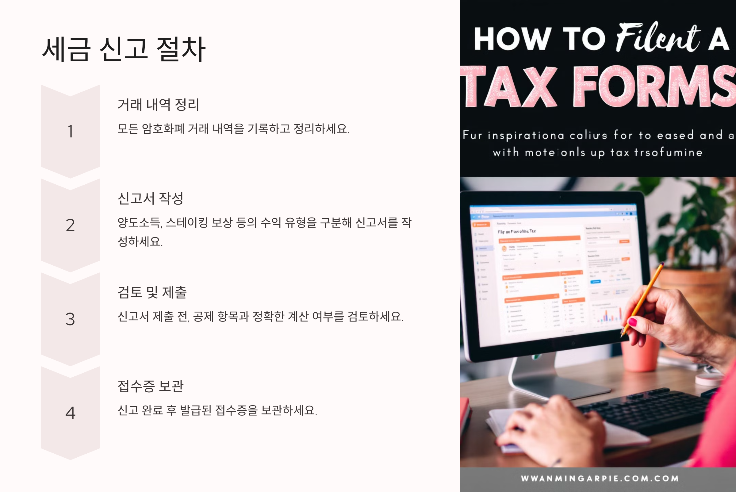 양도소득, 스테이킹 보상 등의 수익 유형을 구분해 신고서를 작성하세요.