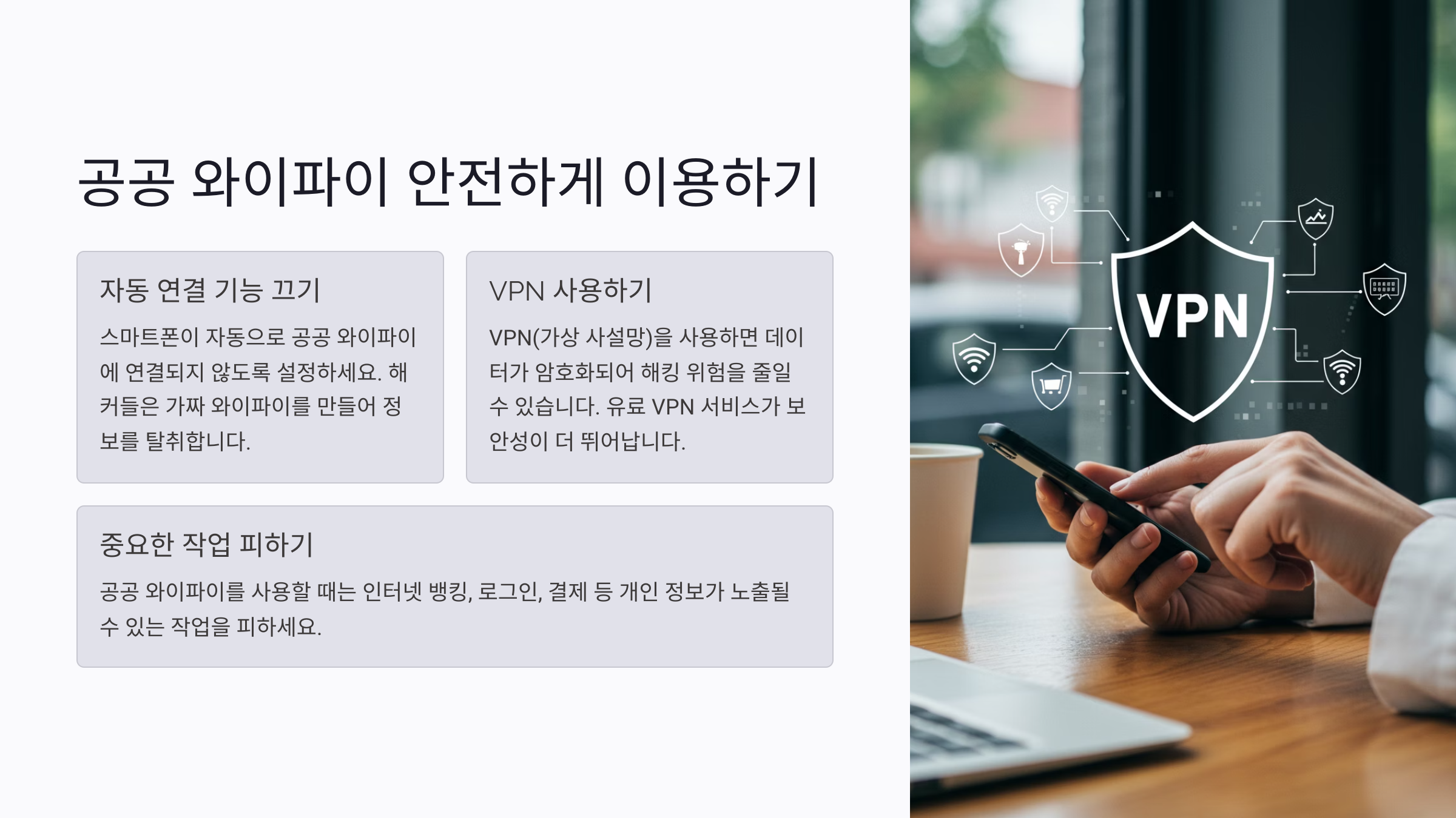 카페, 공항, 지하철 등에서 무료 와이파이를 사용할 때 해킹 위험이 커요. 공공 와이파이를 안전하게 이용하는 방법을 알아볼까요? 🛜