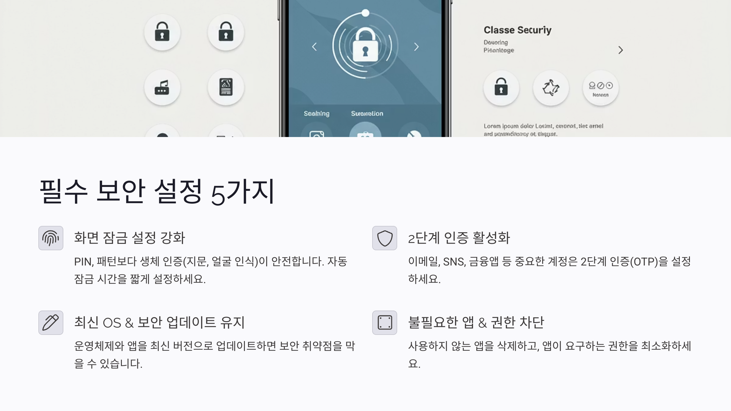 스마트폰 보안을 강화하는 가장 기본적인 방법은 보안 설정을 철저하게 하는 것이에요. 다음의 5가지 설정을 활성화하면 해킹 위험을 크게 줄일 수 있어요.