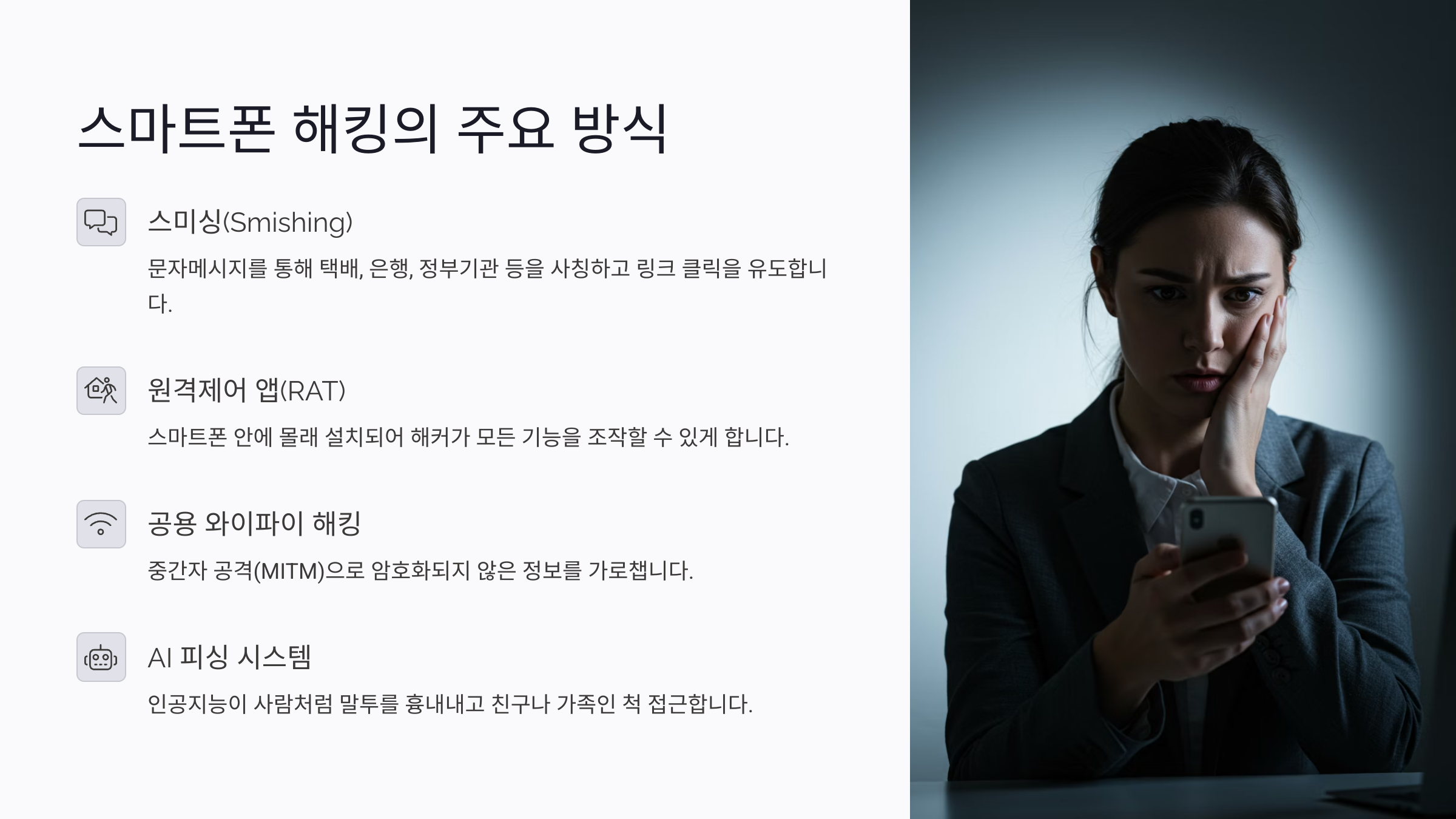 "우리가 해킹 당할 거라고는 생각하지 않잖아요. 그런데 지금도 누군가는 스마트폰 속 정보를 털리고 있어요.