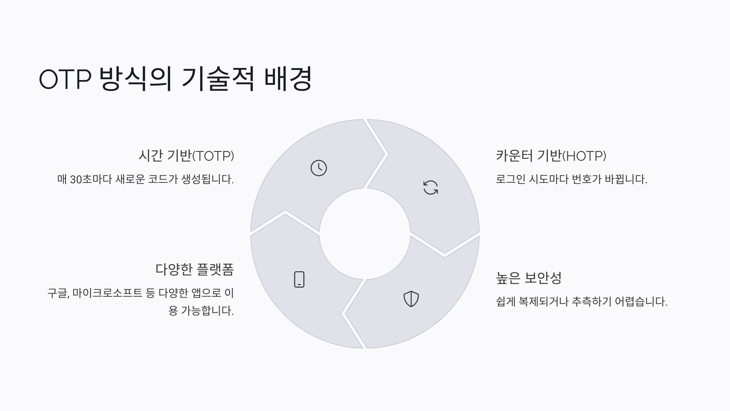 기술적으로 보면 OTP는 두 가지 방식으로 나뉘어요. 시간 기반(TOTP)과 카운터 기반(HOTP)이 있어요. 시간 기반은 매 30초마다 새로운 코드가 생성되고, 카운터 기반은 로그인 시도마다 번호가 바뀌어요. 둘 다 사용자의 장치와 서버가 같은 알고리즘으로 생성된 코드를 대조하여 인증하는 방식이에요.