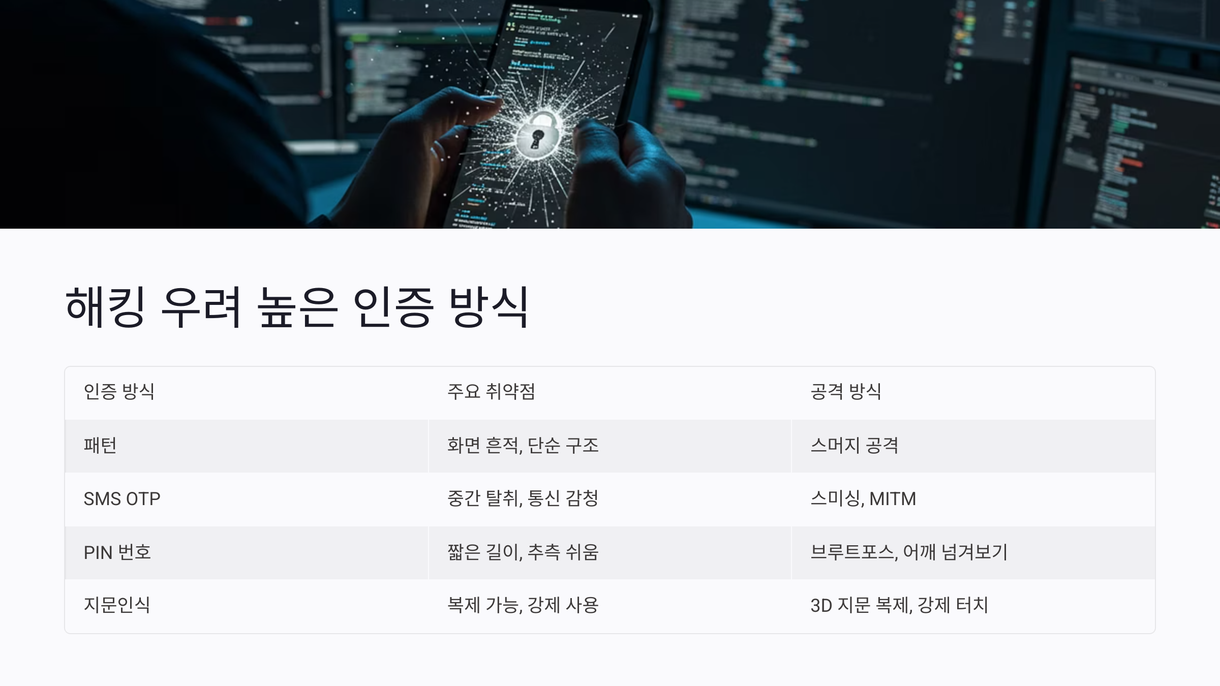 세상에 완벽한 보안은 없다고 해도 과언이 아니에요. 하지만 그 중에서도 유독 해커들의 타깃이 되기 쉬운 인증 방식들이 있어요. 그 이유는 보안성이 낮거나, 사용자의 습관이 쉽게 노출되기 때문이죠. 이 섹션에서는 그중 가장 취약한 인증 방식과 실제 해킹 사례를 함께 살펴볼게요.