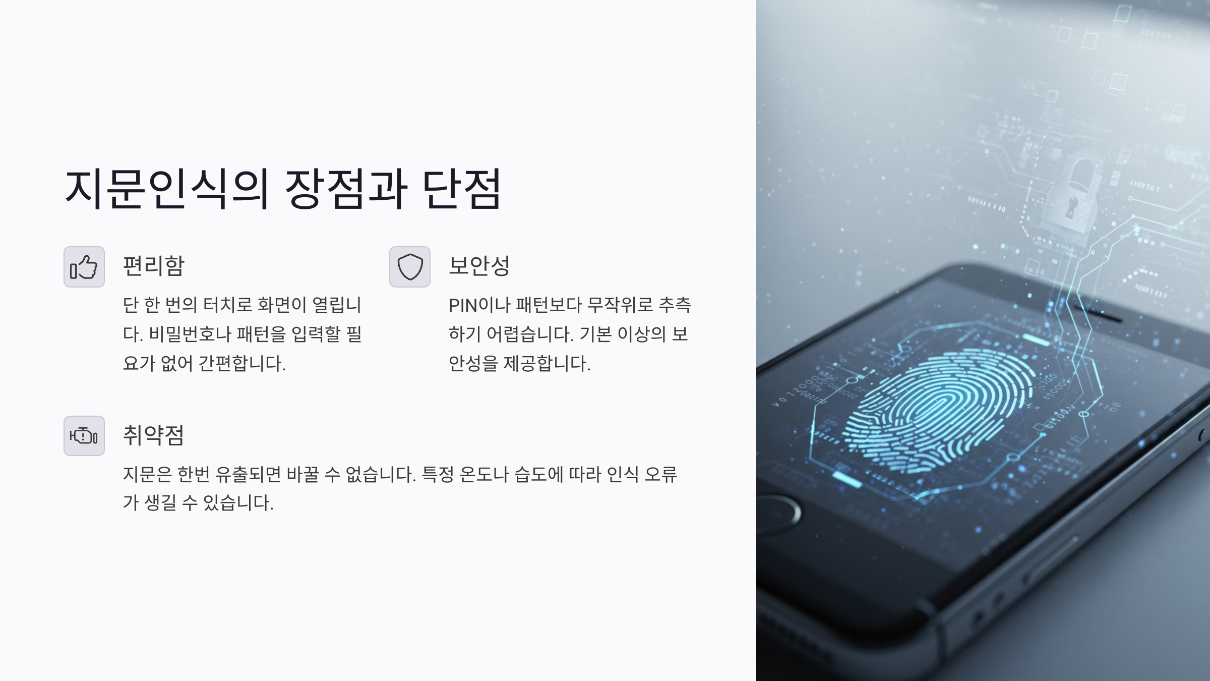 그리고 법적으로도 지문인식은 사용자의 의사와 무관하게 강제로 인증될 수 있어요. 예를 들어 경찰이나 다른 누군가가 사용자의 손가락을 억지로 가져다 대면 잠금 해제가 가능하다는 점도 단점이에요. 패턴이나 비밀번호는 기억 기반이라 이런 강제 접근이 어렵죠.