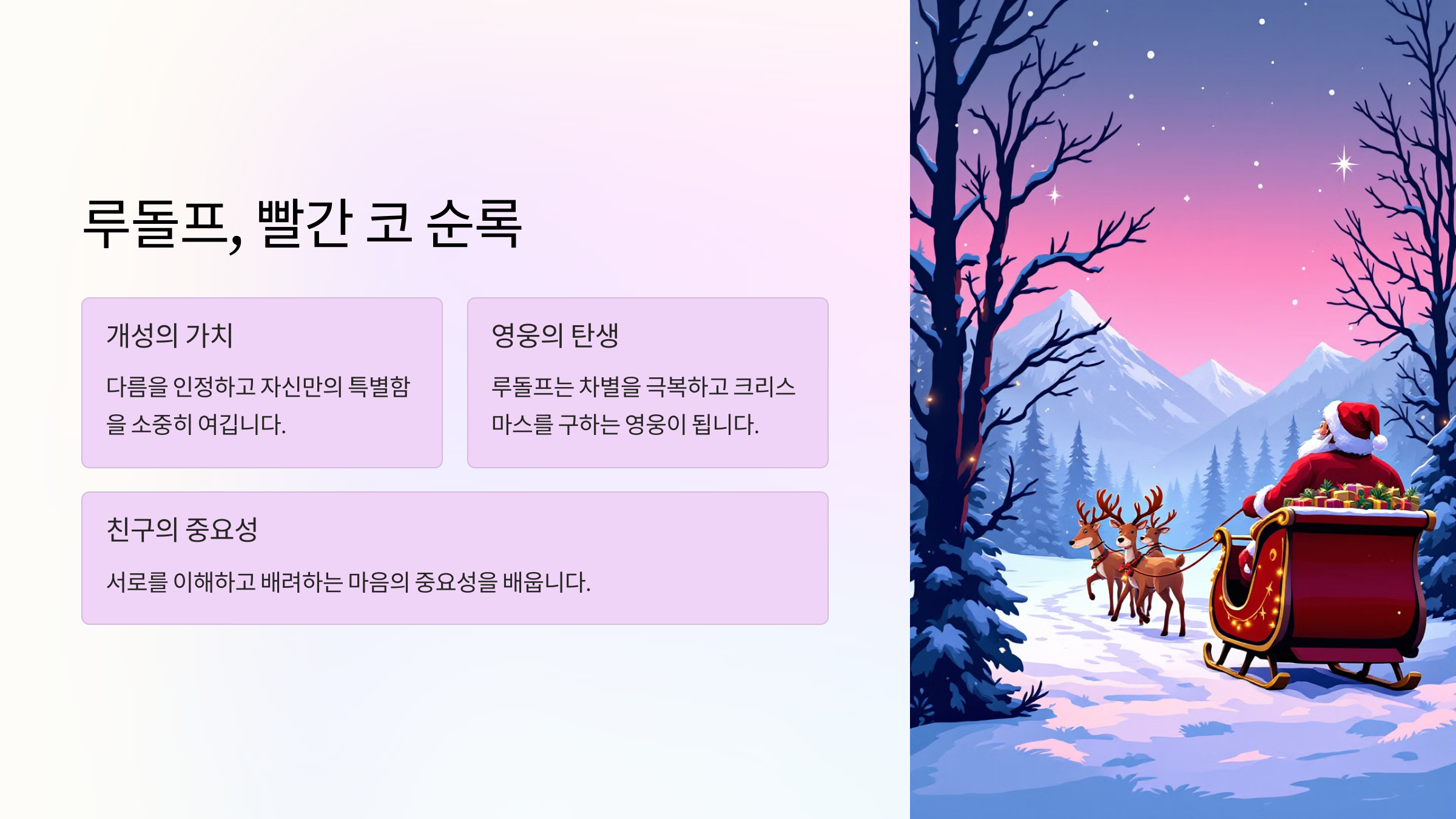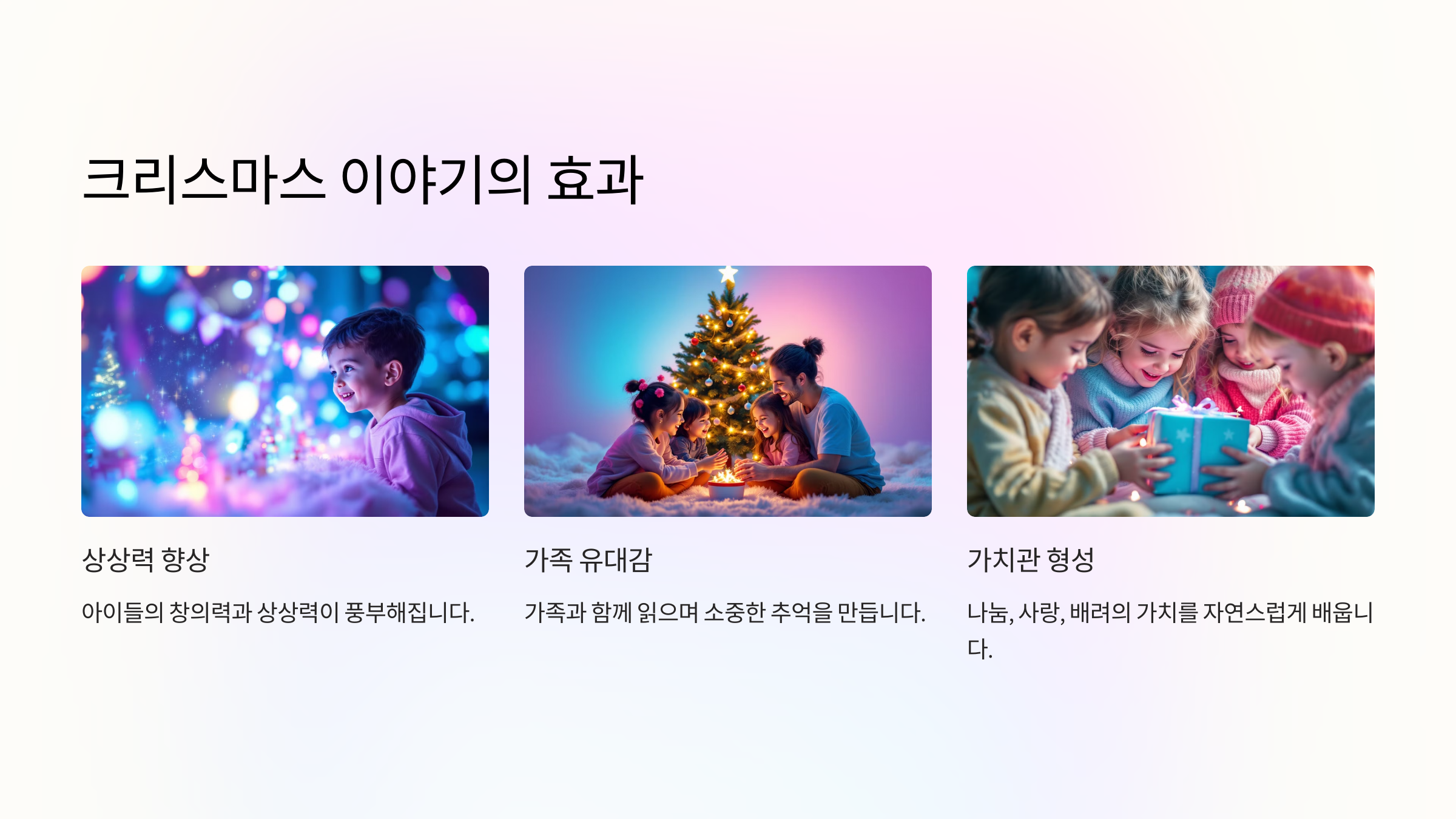 A: 아이들의 상상력과 창의력을 키우며, 크리스마스의 의미와 가족의 소중함을 깨닫게 해줍니다.