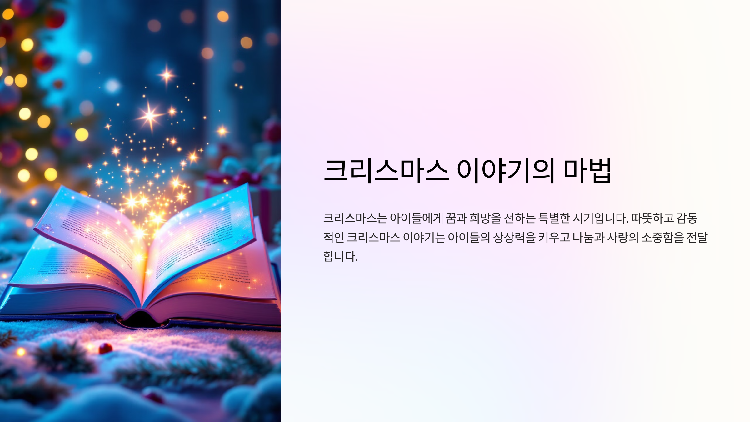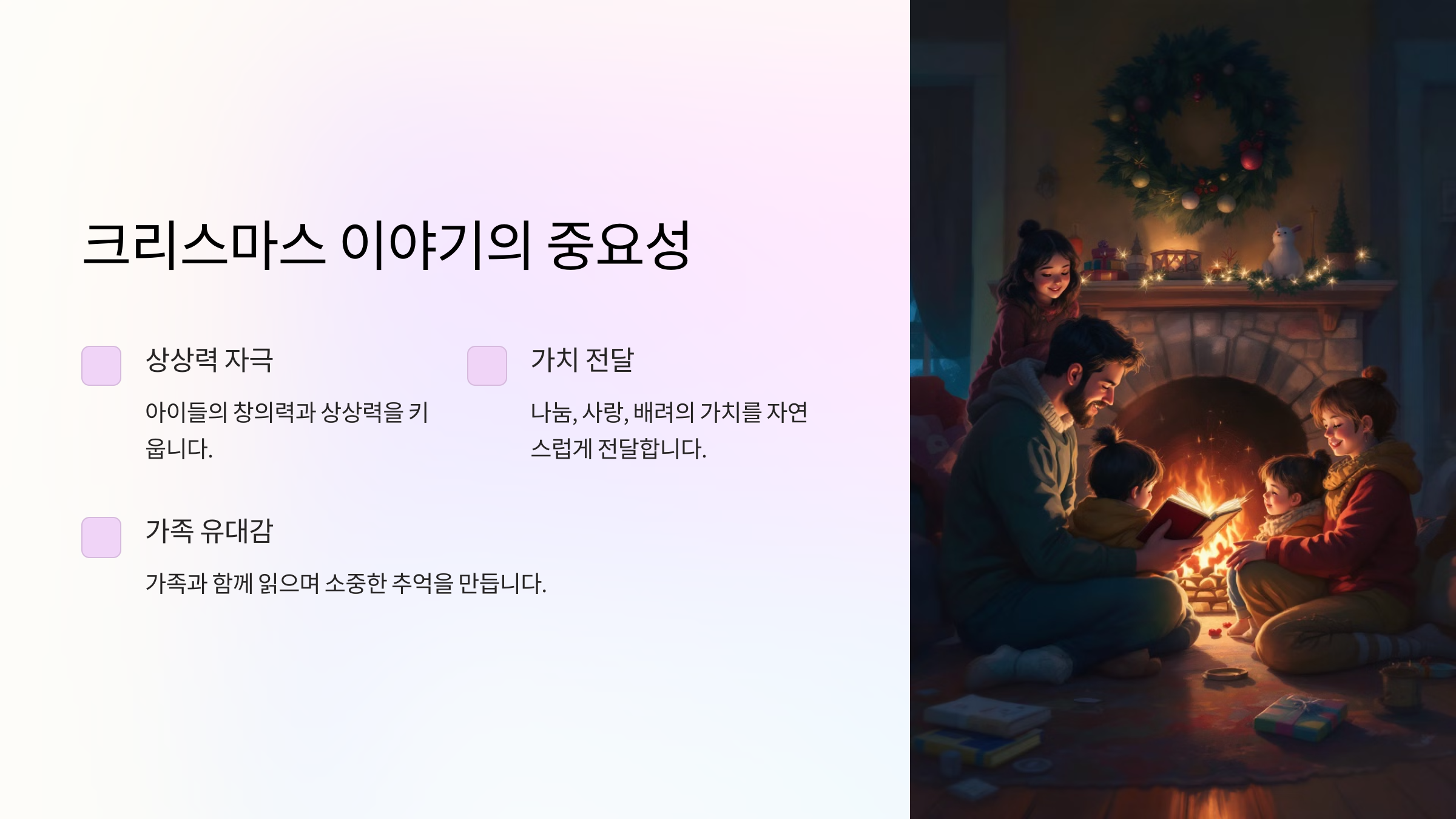 A: 크리스마스 이야기는 나눔과 배려를 배우게 하며, 가족과의 소중한 시간을 만들어줍니다.