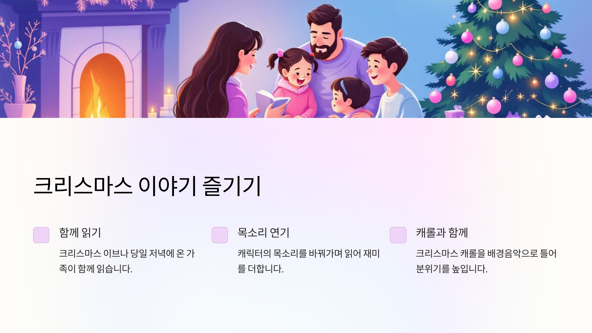 A: 크리스마스 이브나 크리스마스 당일 저녁에 온 가족이 함께 읽으면 더욱 따뜻한 추억을 만들 수 있습니다.