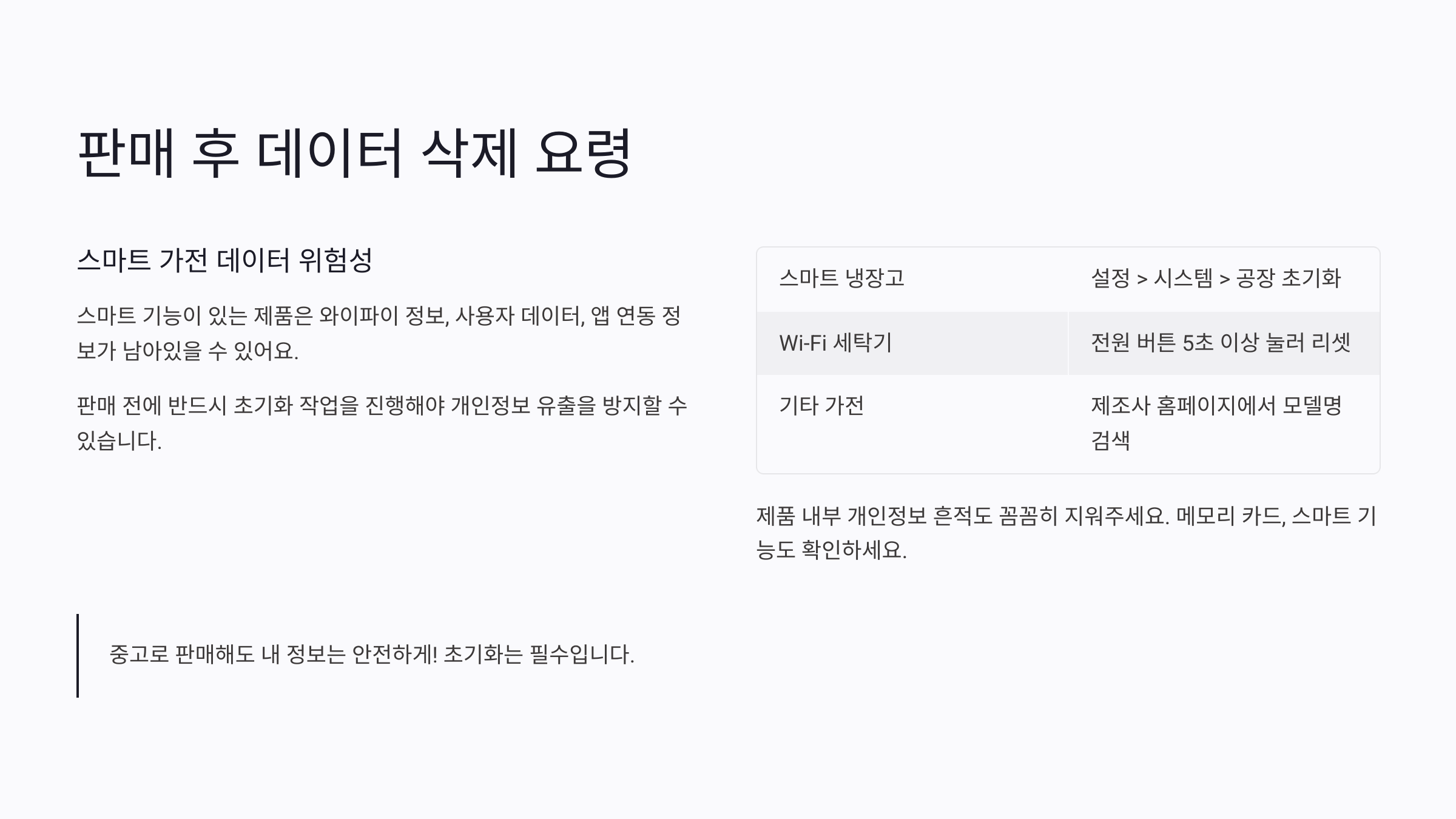 또한 제품 내부의 개인정보 흔적도 지워주는 게 좋아요. 세탁기 필터, 냉장고 메모리 카드 슬롯, 스마트 기능 탑재 모델은 반드시 초기화한 뒤 판매해야 해요 🔒