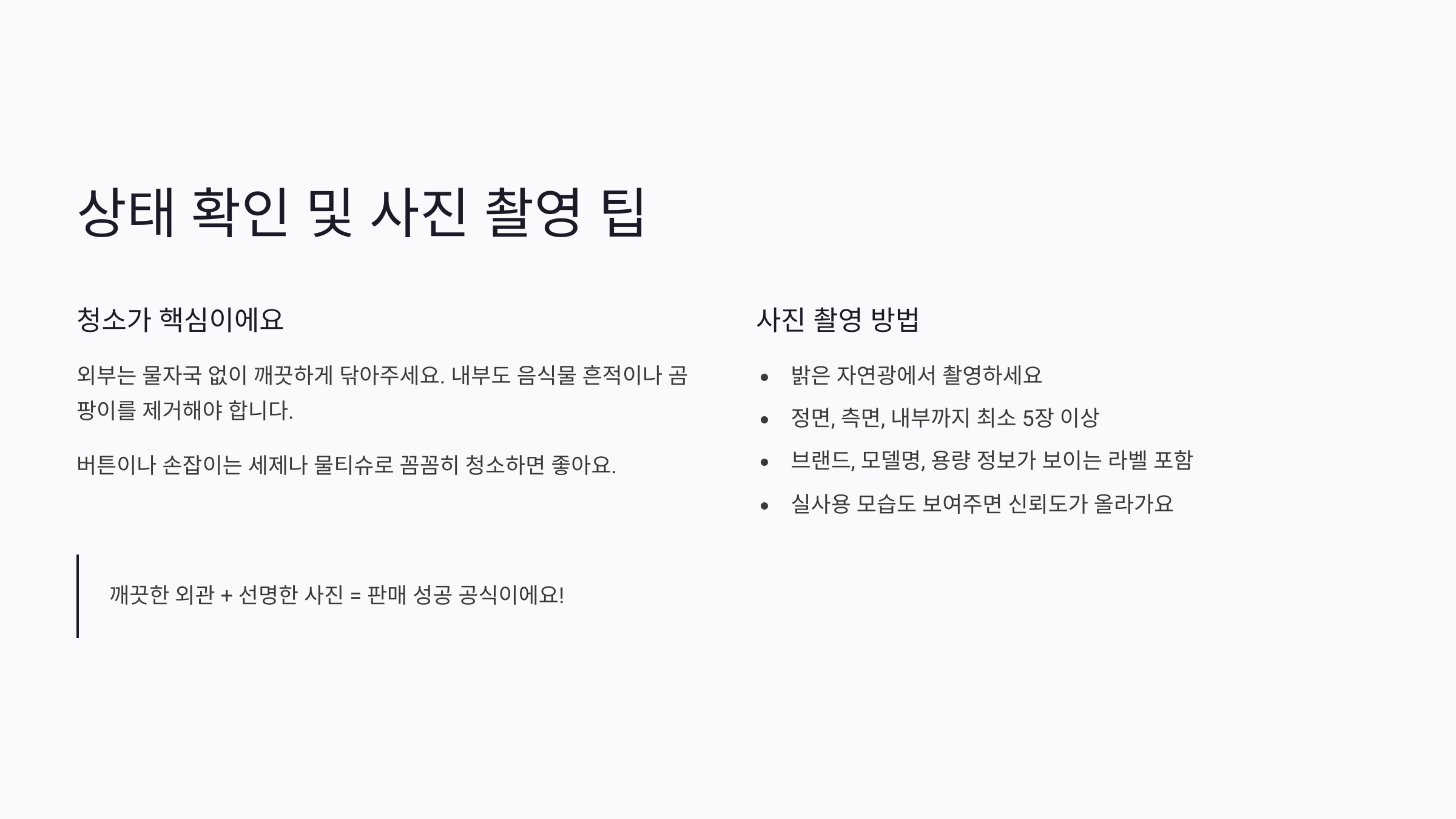 중고 냉장고나 세탁기를 팔 때 가장 중요한 건 바로 '첫인상'이에요. 사용감이 조금 있더라도 깨끗하게 보이고, 자세한 사진이 있다면 훨씬 빠르게 팔린답니다 😊