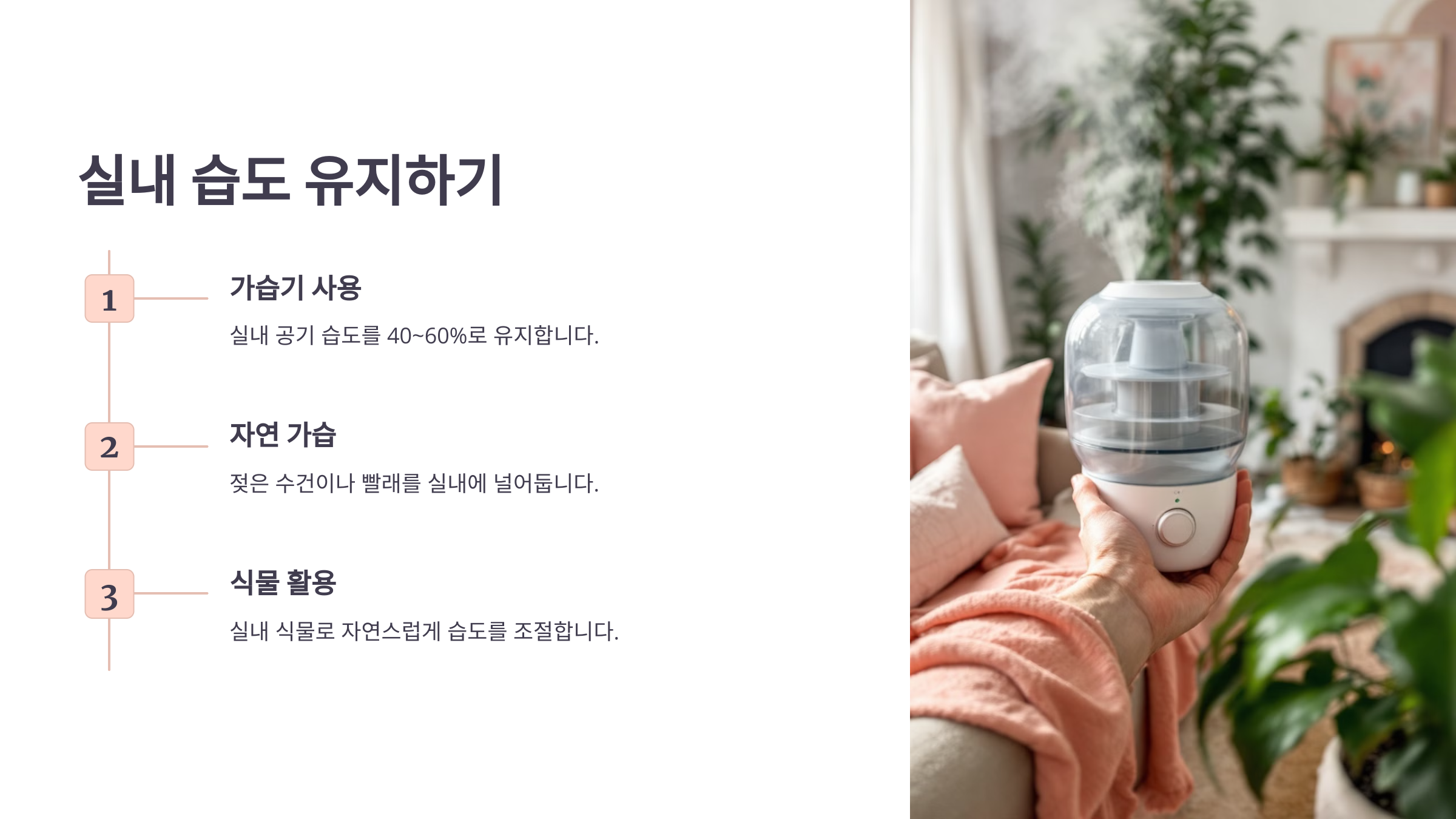 실내 습도를 적절하게 유지하면 건강과 쾌적함을 동시에 챙길 수 있습니다.