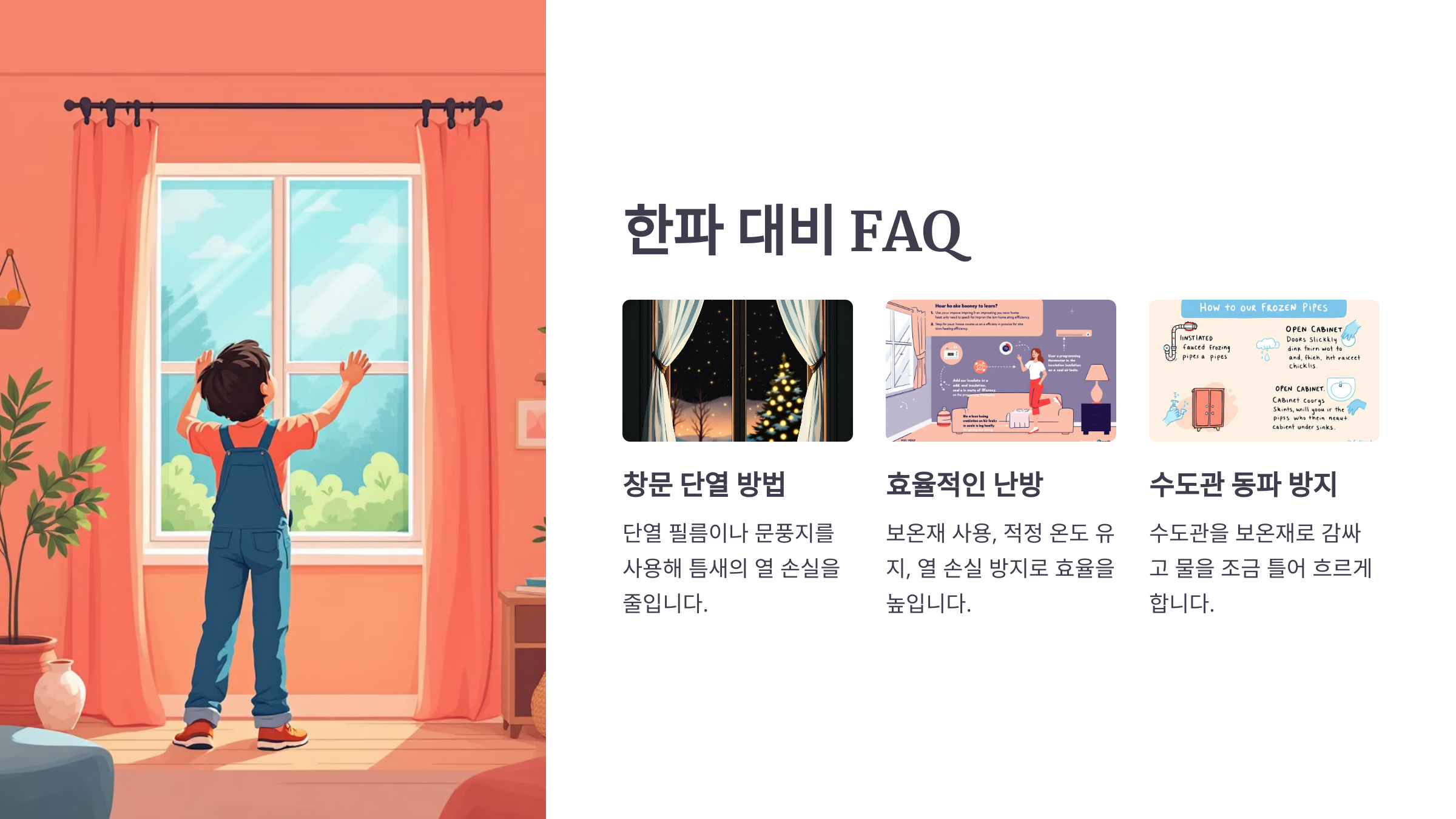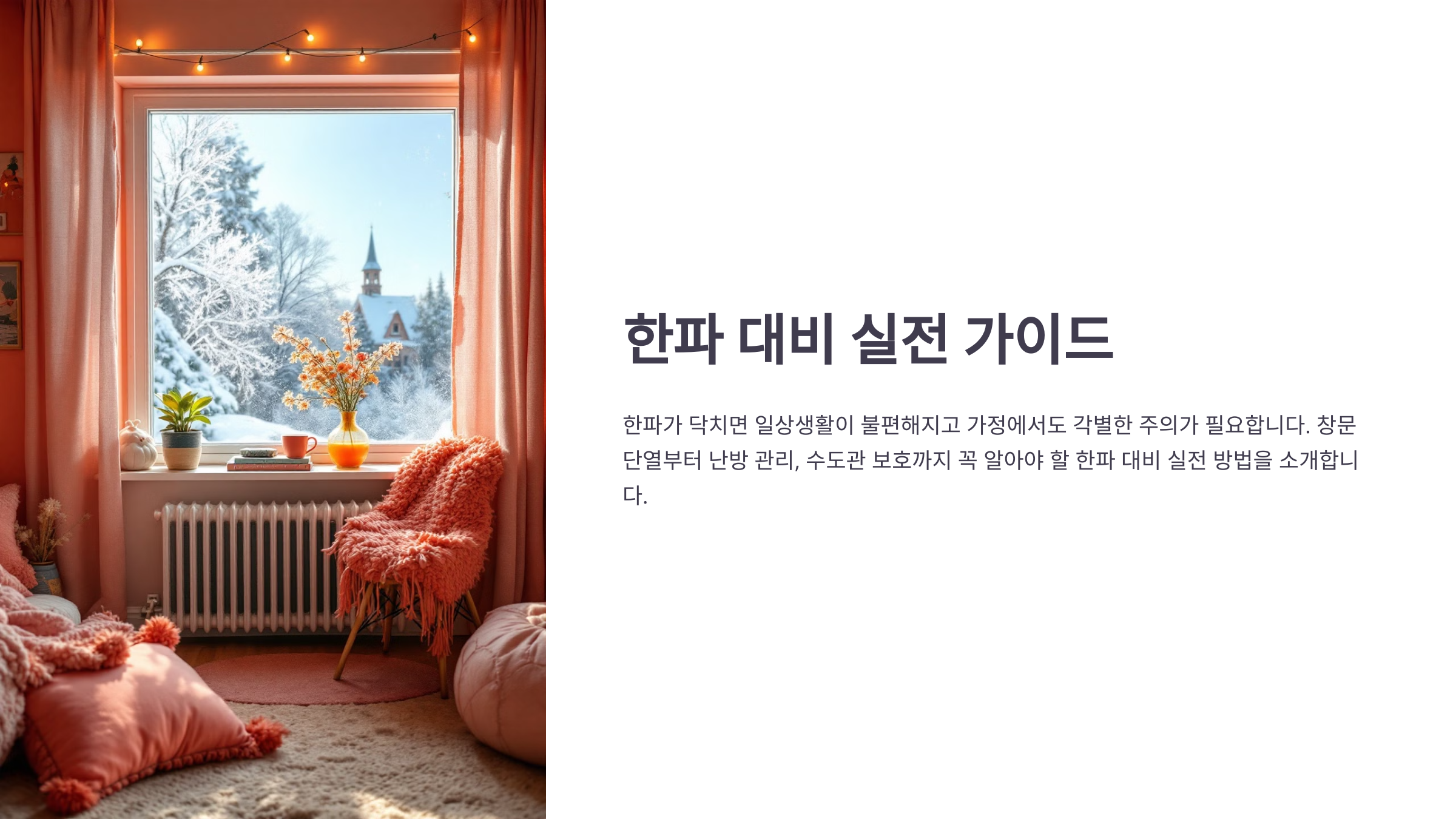 한파가 닥치면 일상생활이 불편해지고 가정에서도 각별한 주의가 필요합니다. 창문 단열부터 난방 관리, 수도관 보호까지 꼭 알아야 할 한파 대비 실전 방법을 소개합니다.