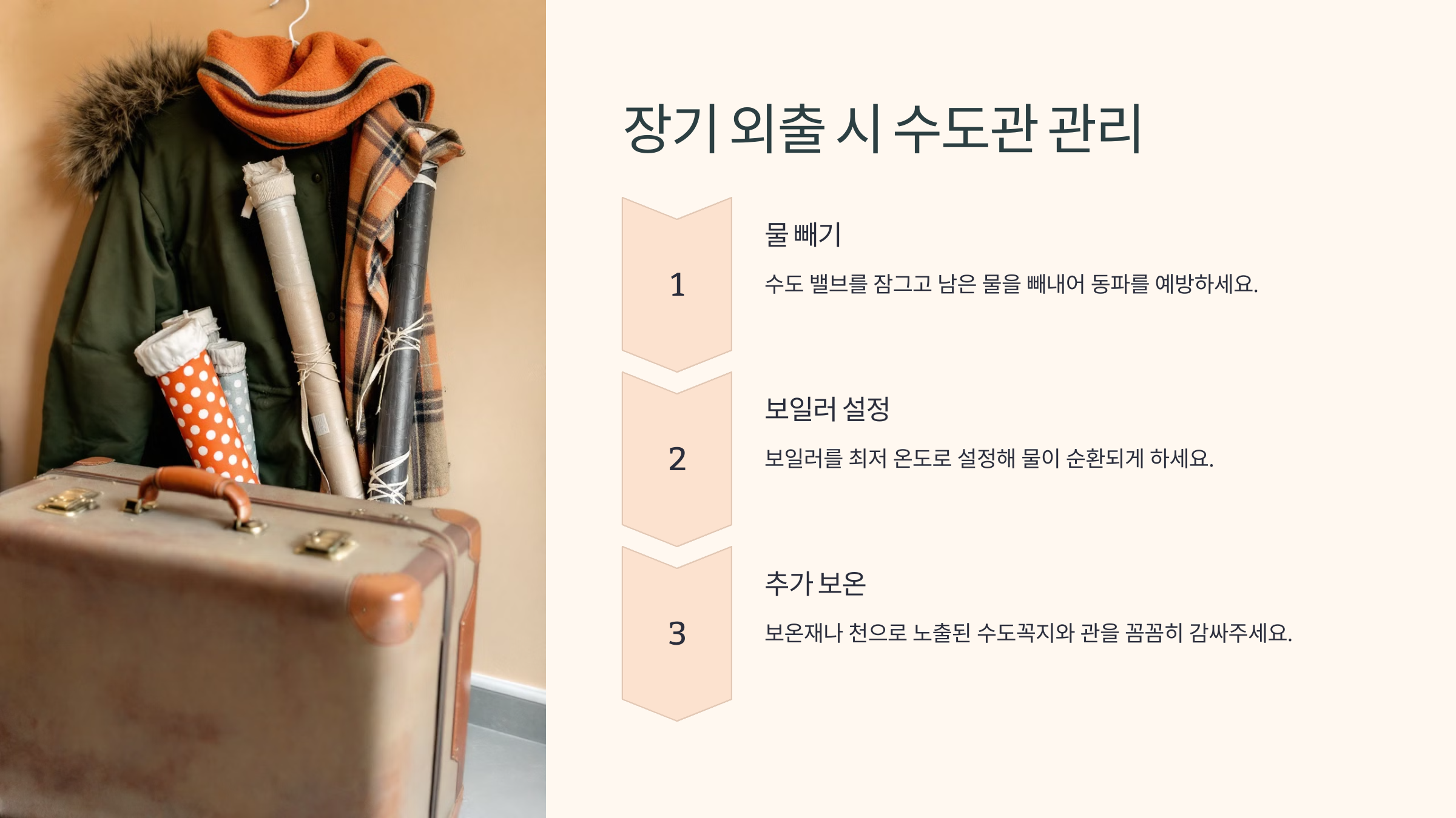 장기 외출 전에는 수도관 동파를 방지하기 위한 준비가 필요합니다.